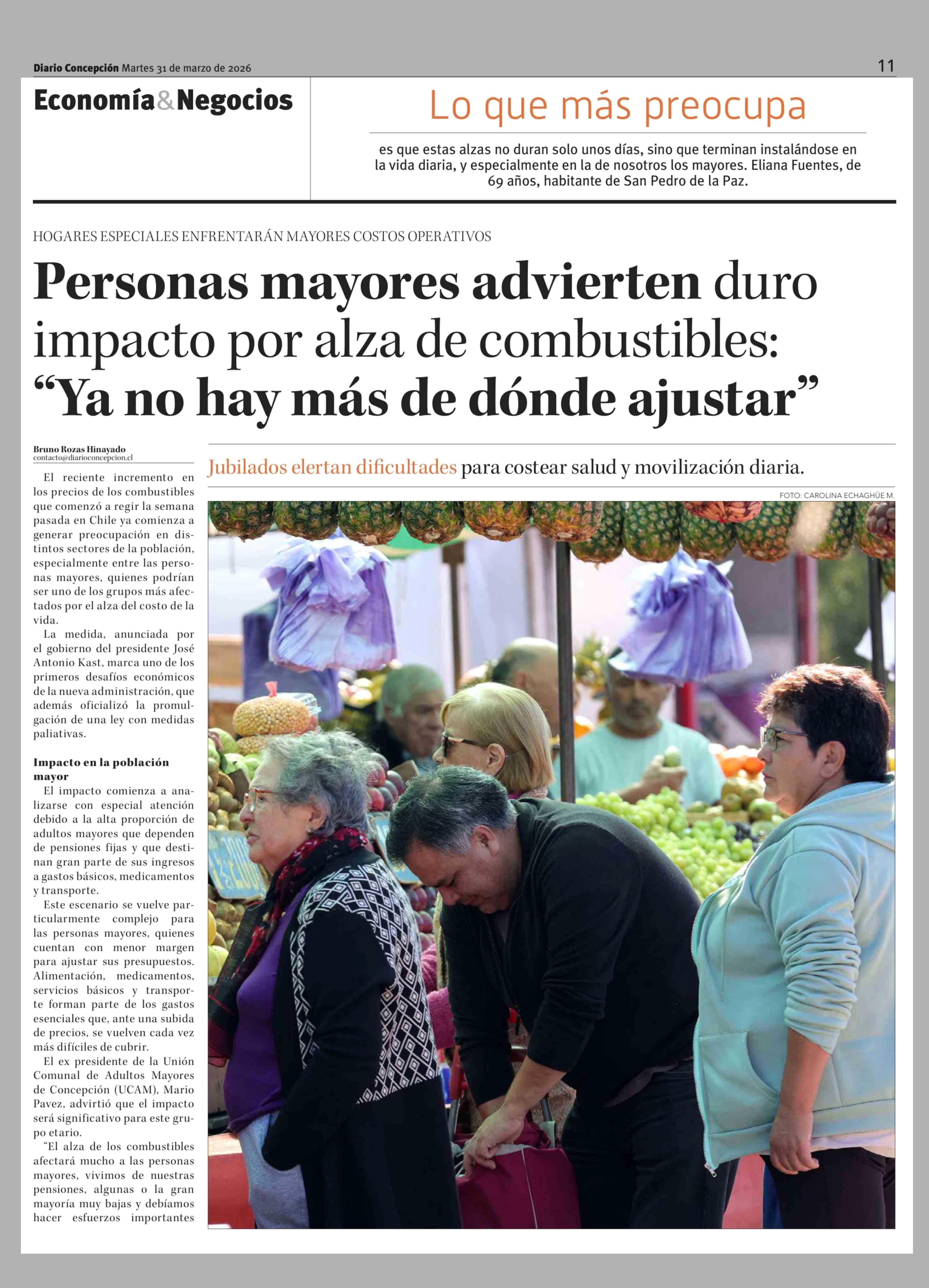 Personas mayores advierten duro impacto por alza de combustibles: "Ya no hay más de dónde ajustar" 01-04-2026 Diario Concepción |