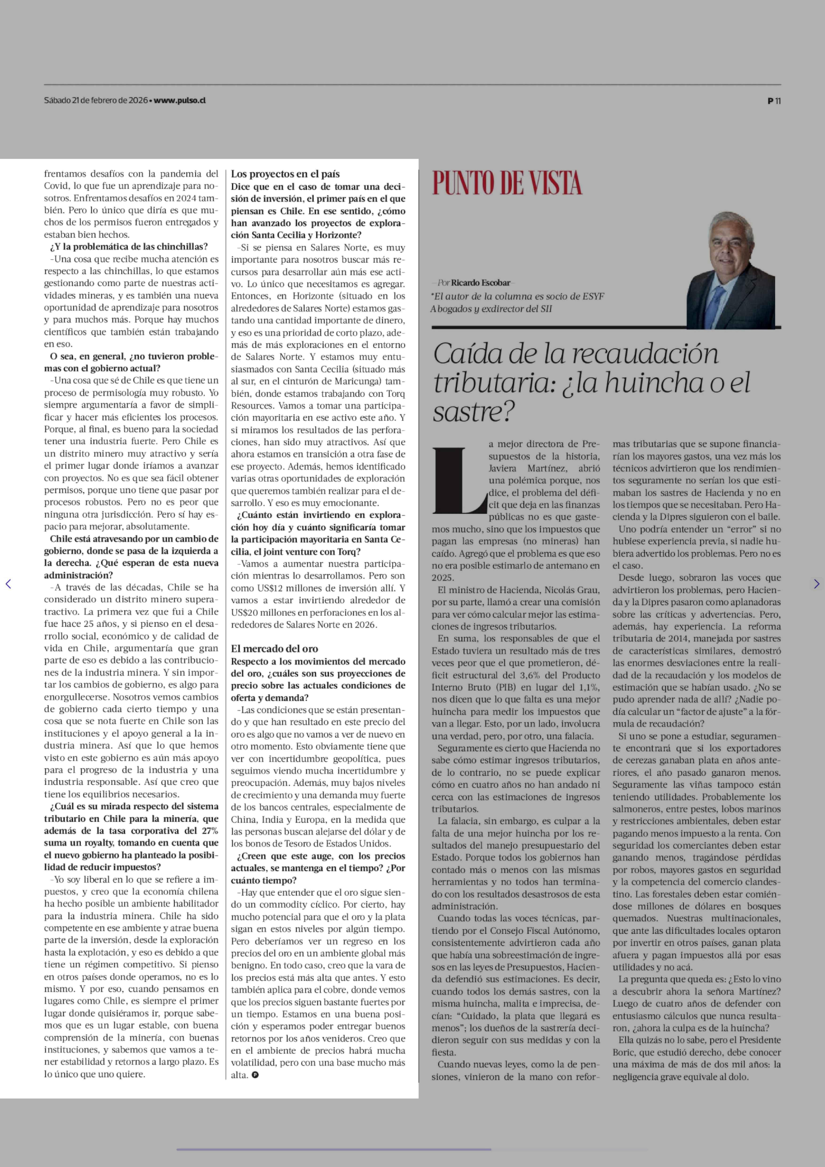 CEO de minera de oro Gold Fields: "Chile es el primer país donde quisiéramos avanzar con proyectos" 21-02-2026 La Tercera |