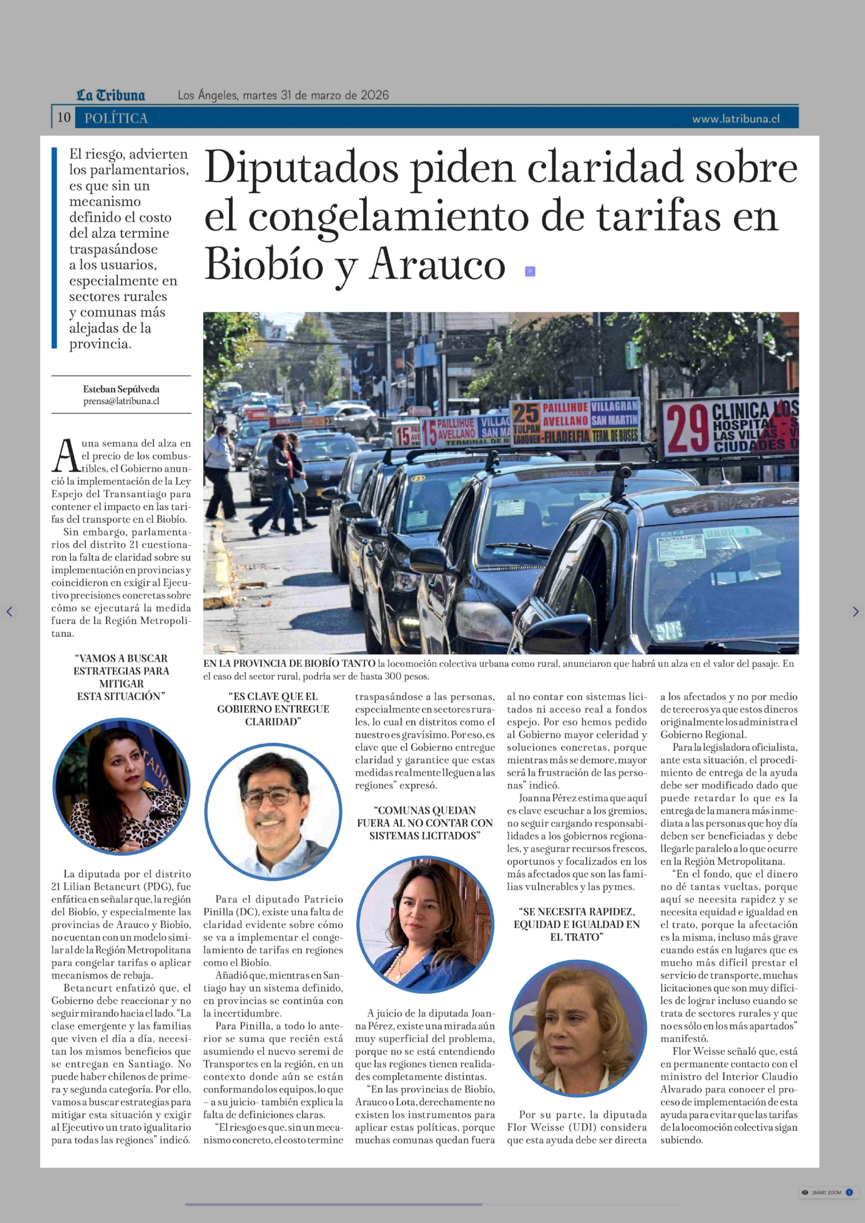 Diputados piden claridad sobre el congelamiento de tarifas en Biobio y Arauco 31-03-2026 La Tribuna |