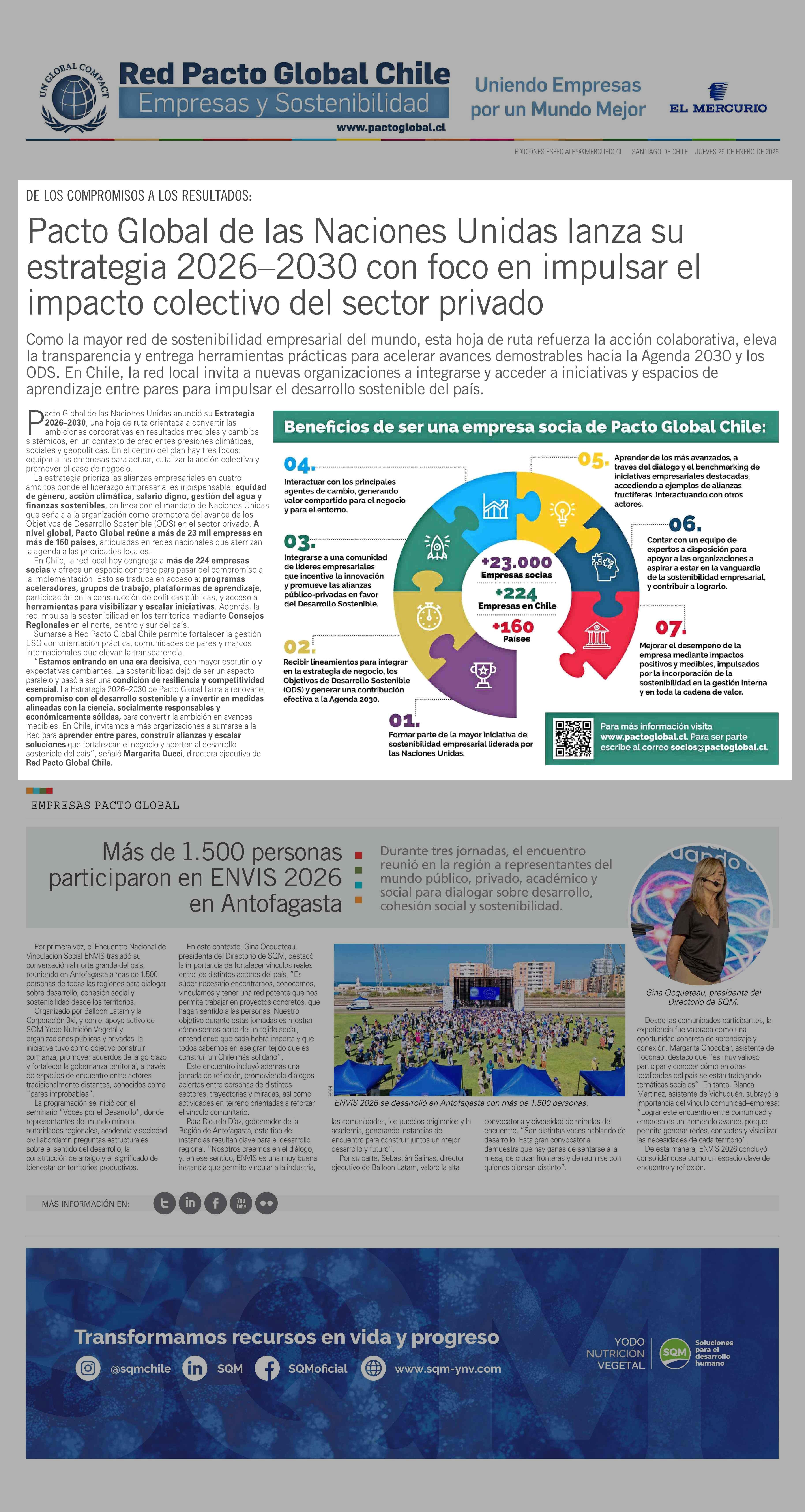 Pacto Global de las Naciones Unidas lanza su estrategia 2026–2030 con foco en impulsar el impacto colectivo del sector privado 29-01-2026 El Mercurio |