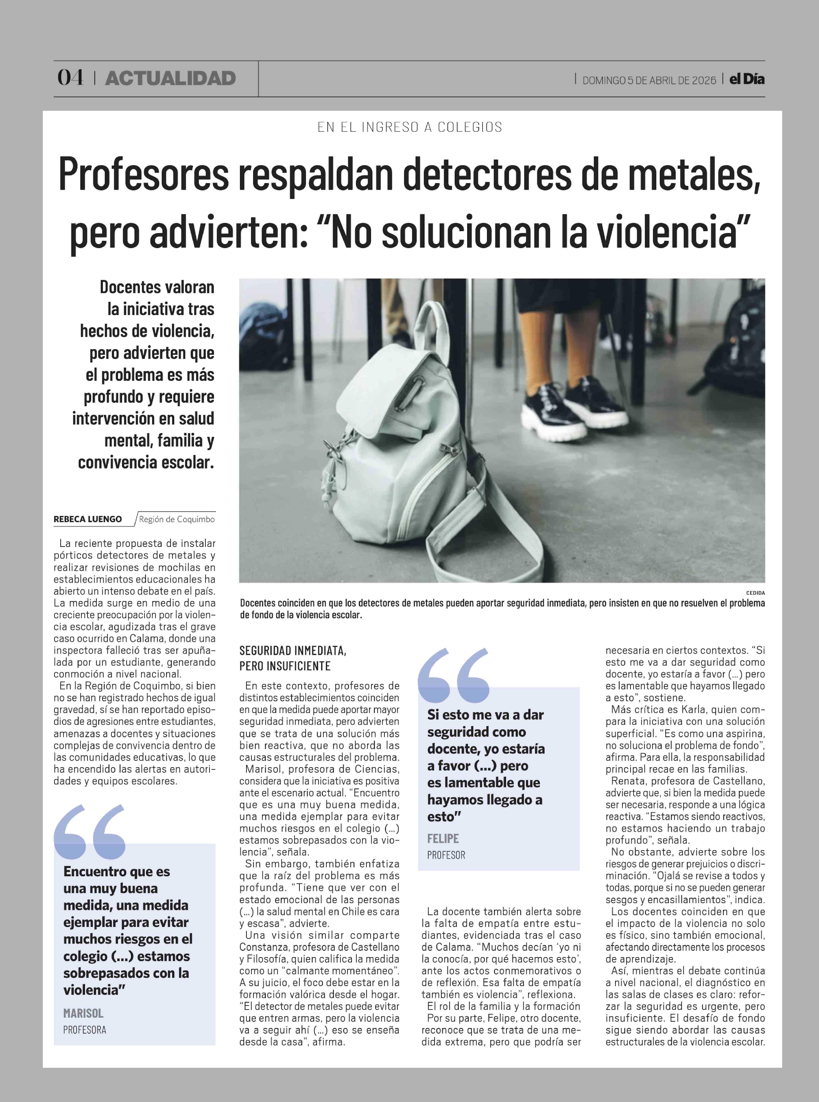 Profesores respaldan detectores de metales, pero advierten: "No solucionan la violencia" 05-04-2026 El Día |
