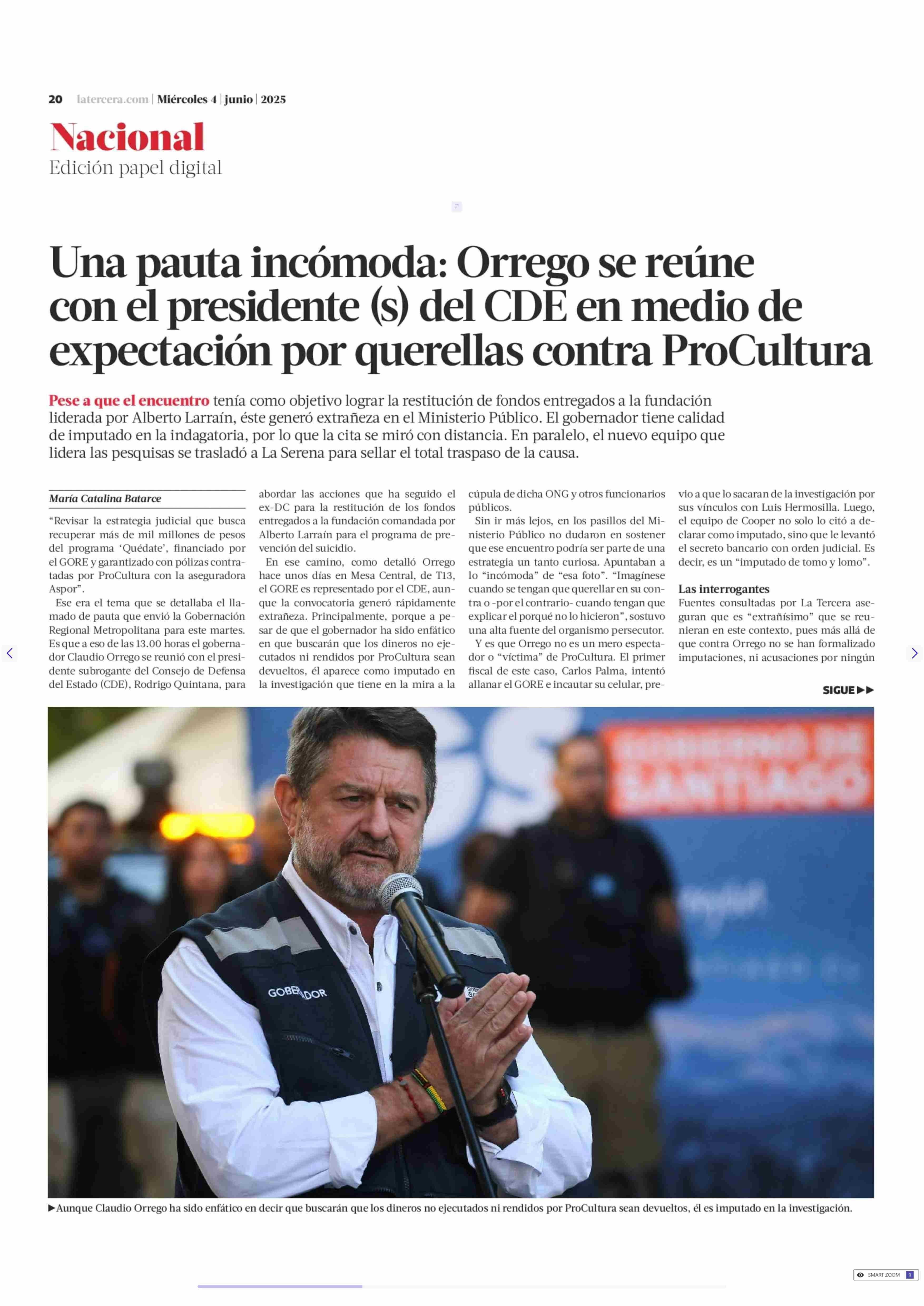 Una pauta incómoda: Orrego se reúne con el presidente (s) del CDE en medio de expectación por querellas contra ProCultura 04-06-2025 La Tercera |