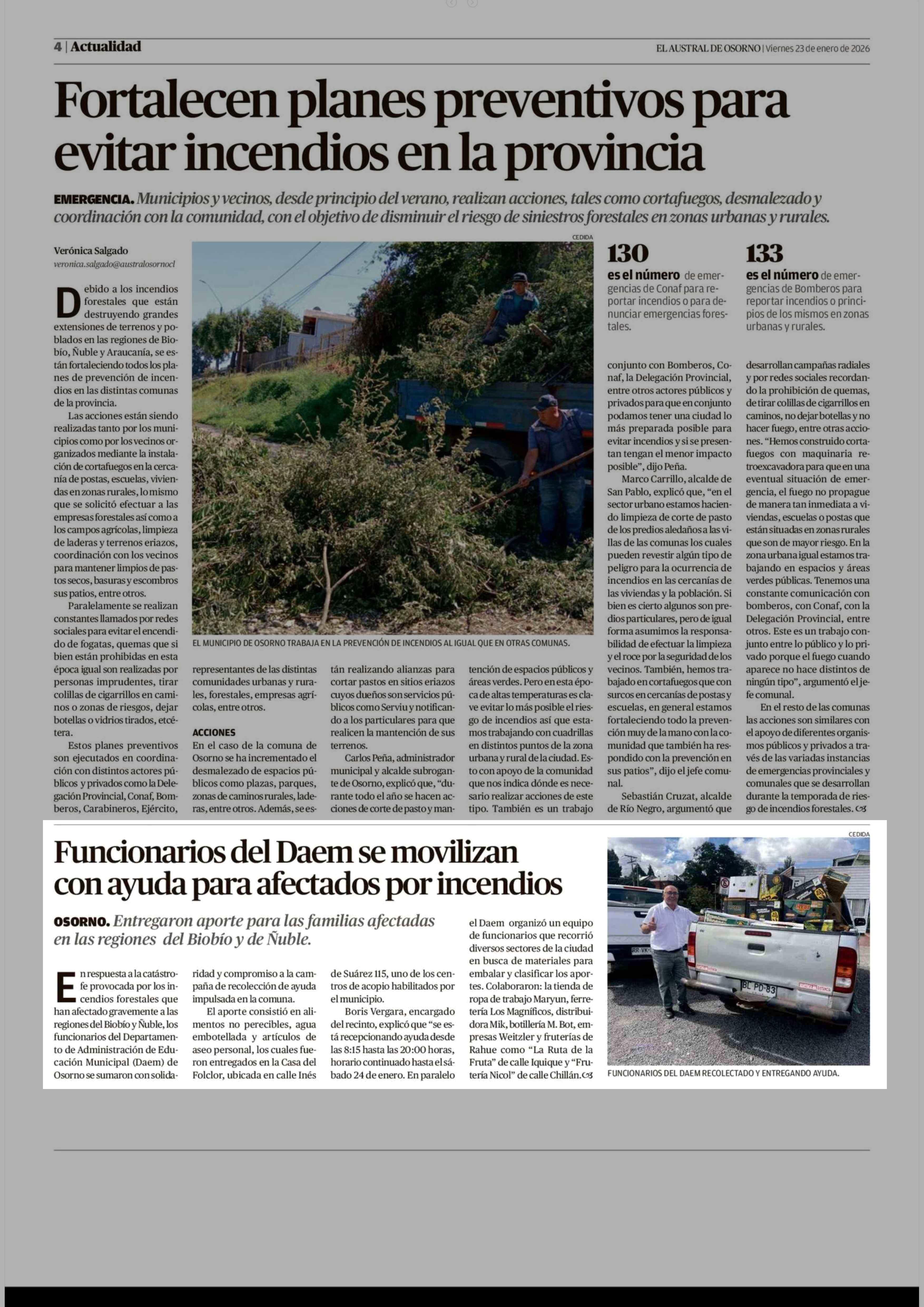 Funcionarios del Daem se movilizan con ayuda para afectados por incendios 23-01-2026 El Austral de Osorno |