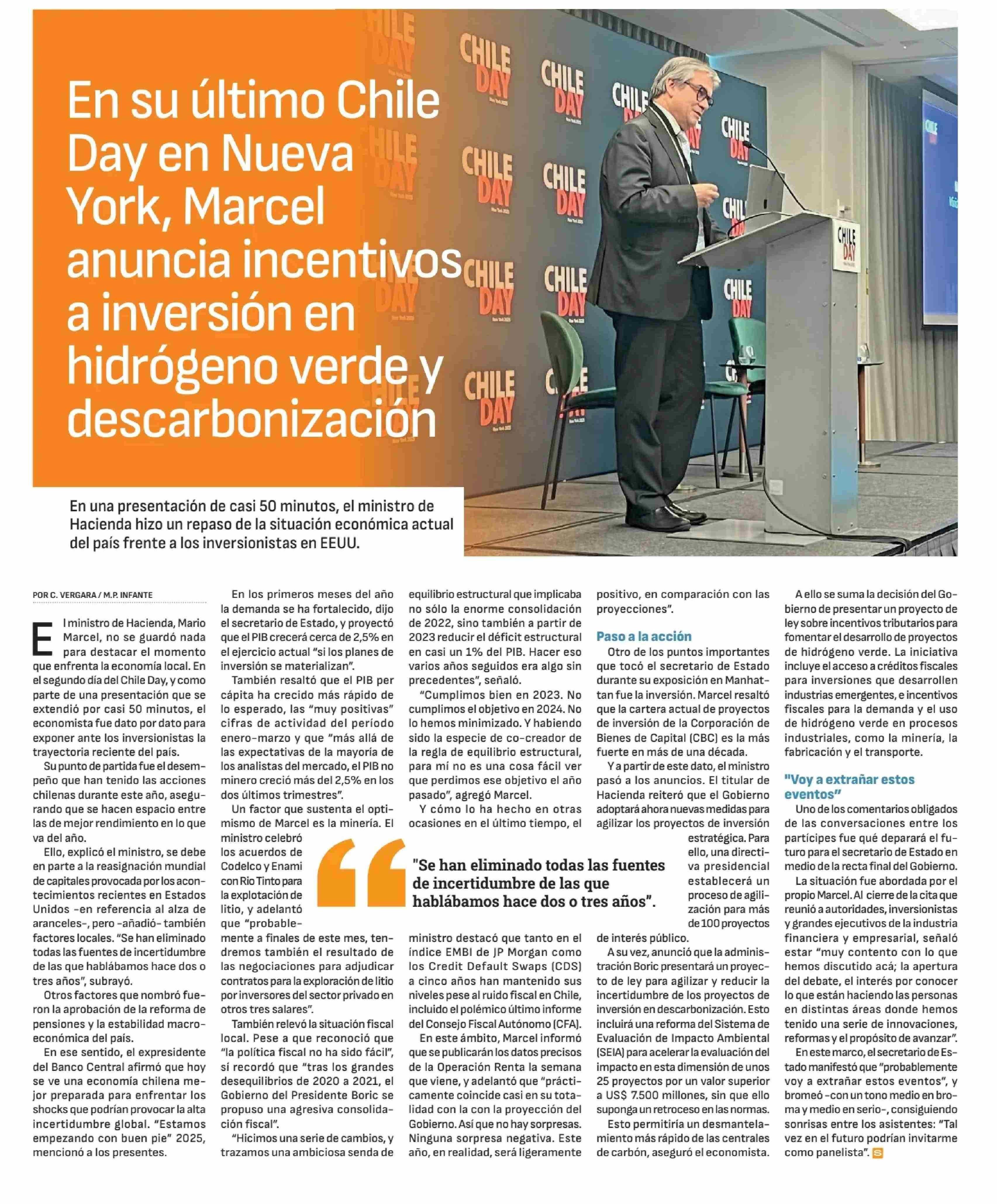 En su último Chile Day en Nueva York, Marcel anuncia incentivos a inversión en hidrógeno verde y descarbonización 24-05-2025 Diario Financiero |