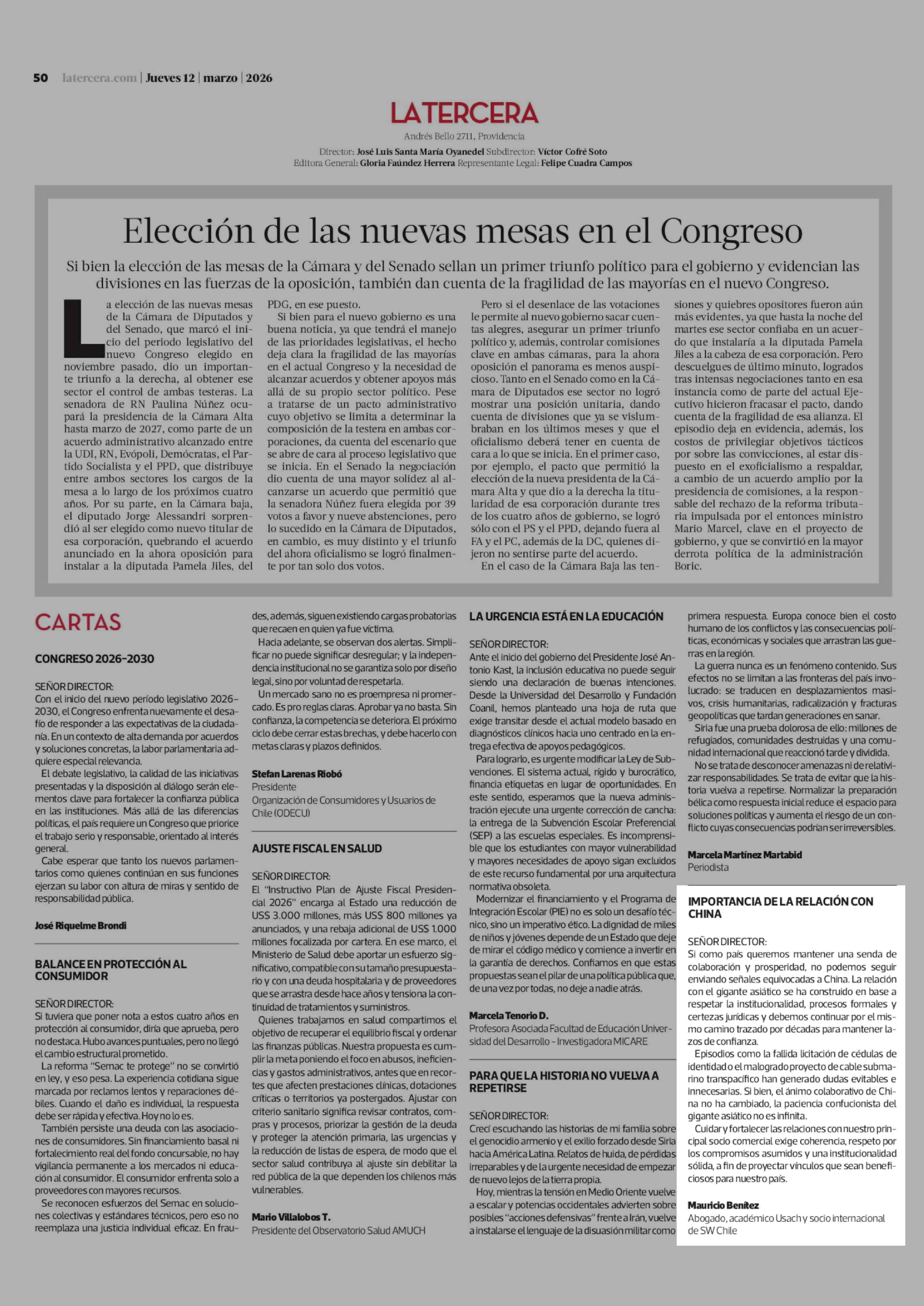 Cartas: IMPORTANCIA DE LA RELACIÓN CON CHINA 12-03-2026 La Tercera |