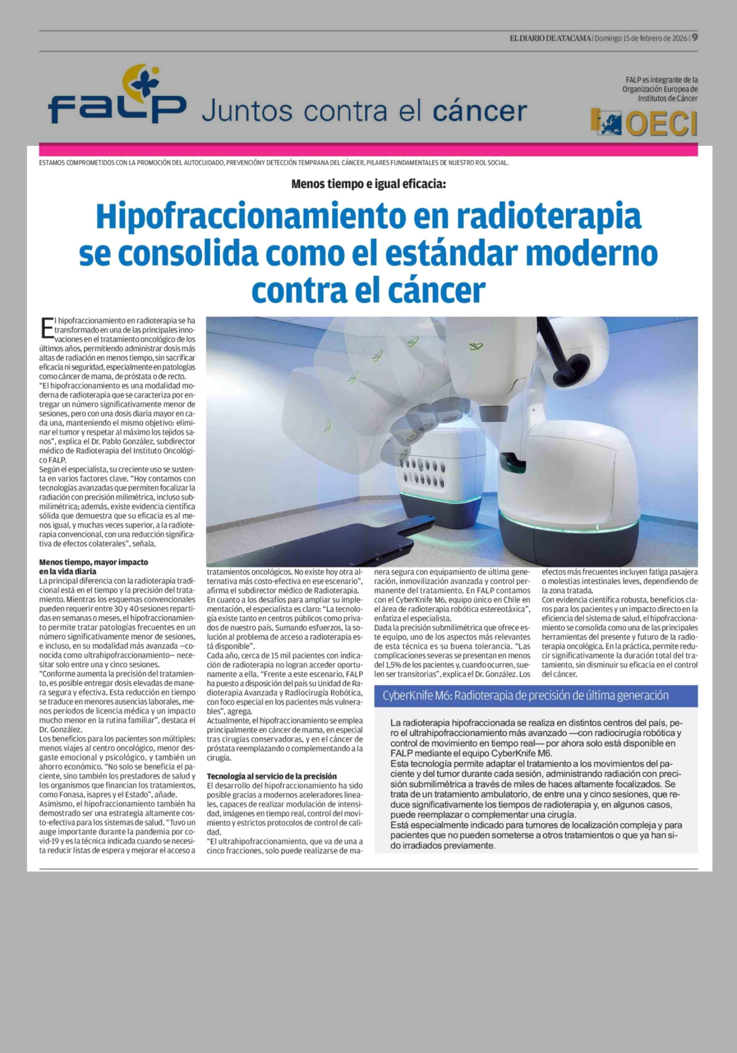 Hipofraccionamiento en radioterapia se consolida como el estándar moderno contra el cáncer 15-02-2026 El Diario de Atacama |