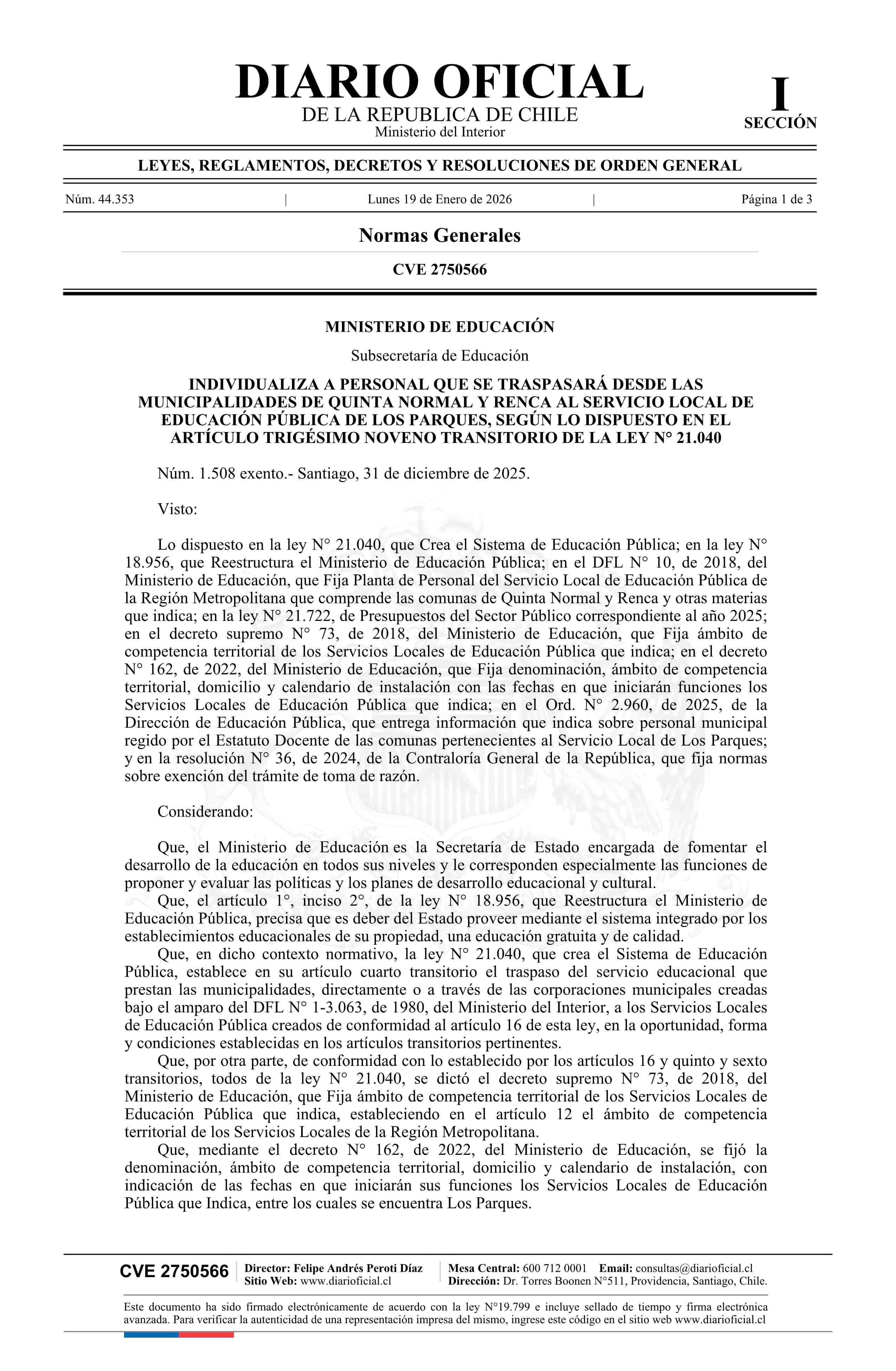 Título: Decreto exento número 1.508, de 2025.- Individualiza a personal que se traspasará desde las Municipalidades de Quinta Normal y Renca al Servicio Local de Educación Pública de Los Parques, según lo dispuesto en el artículo trigésimo noveno transitorio de la ley N° 21.040