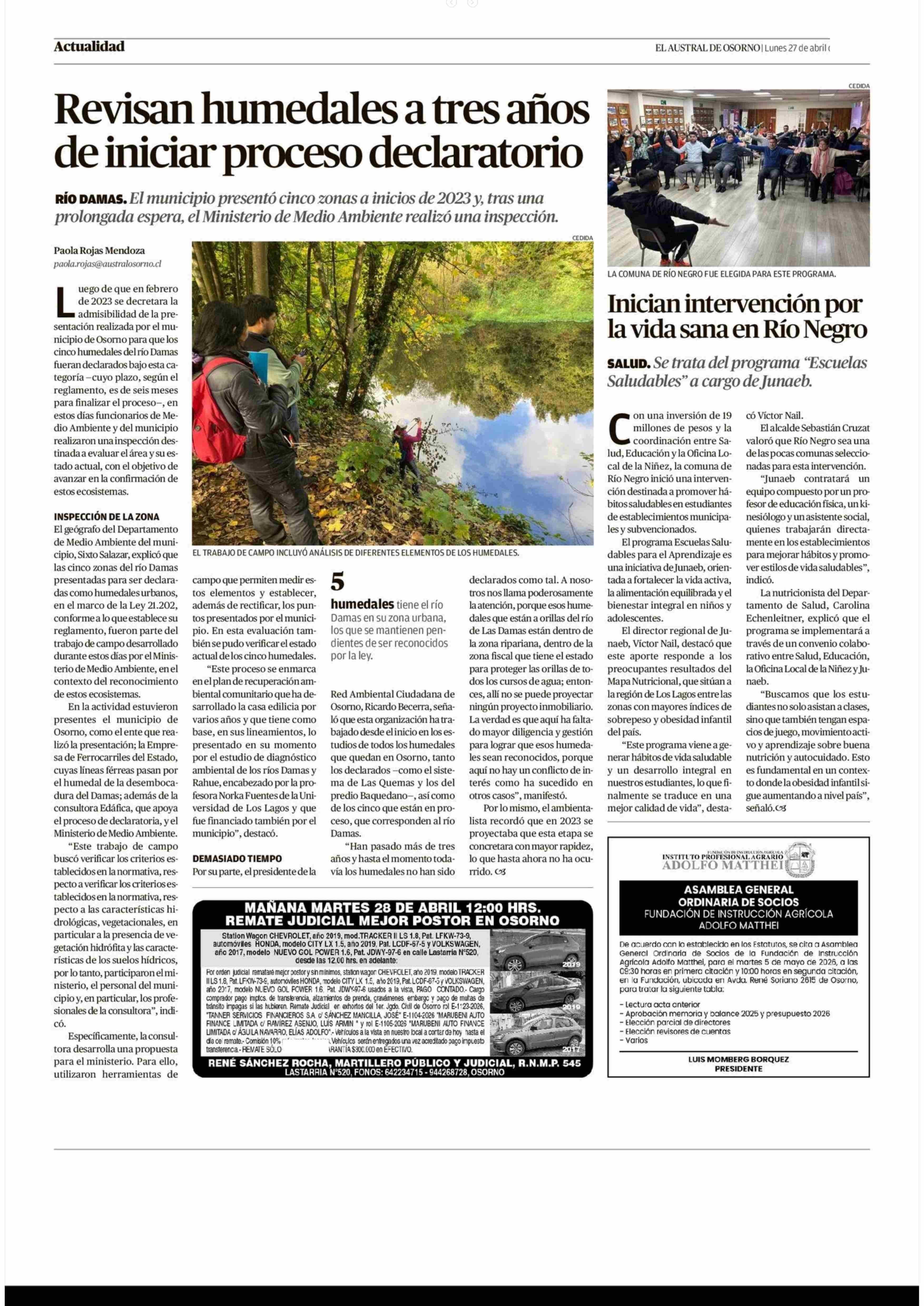 Revisan humedales a tres años de iniciar proceso declaratorio 27-04-2026 El Austral de Osorno |