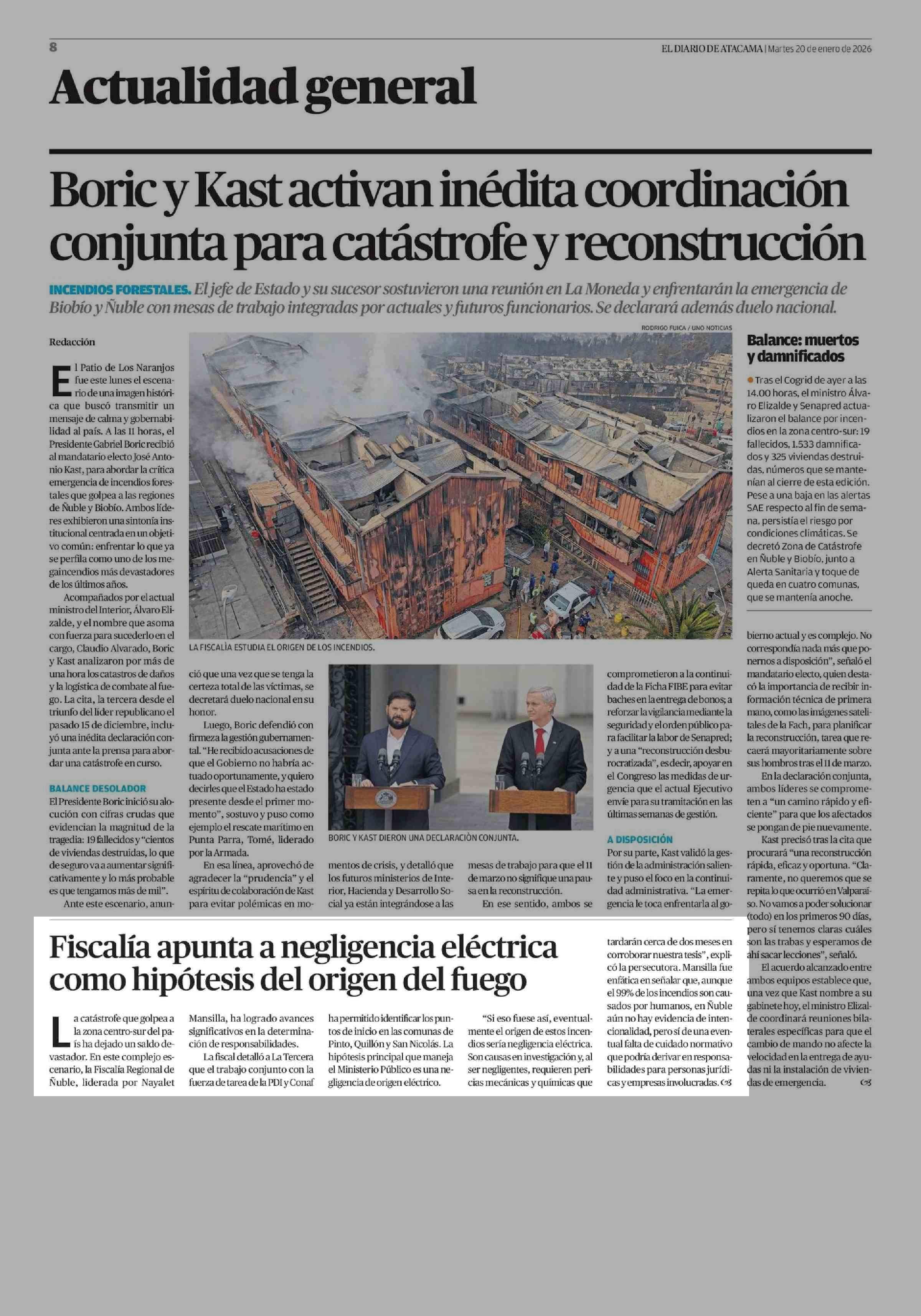 Fiscalía apunta a negligencia eléctrica como hipótesis del origen del fuego 20-01-2026 El Diario de Atacama |