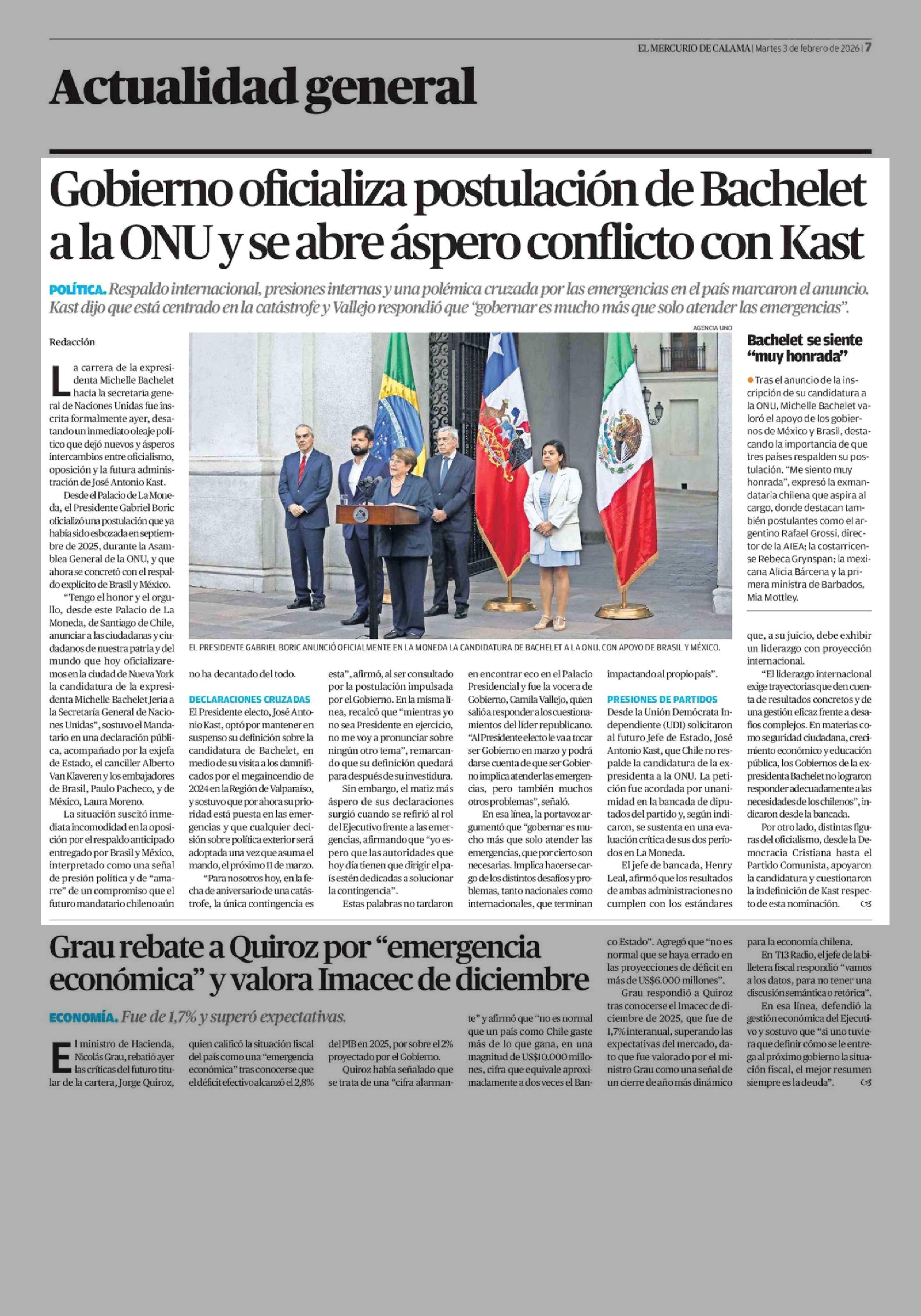 Gobierno oficializa postulación de Bachelet a la ONU y se abre áspero conflicto con Kast 03-02-2026 El Mercurio de Calama |