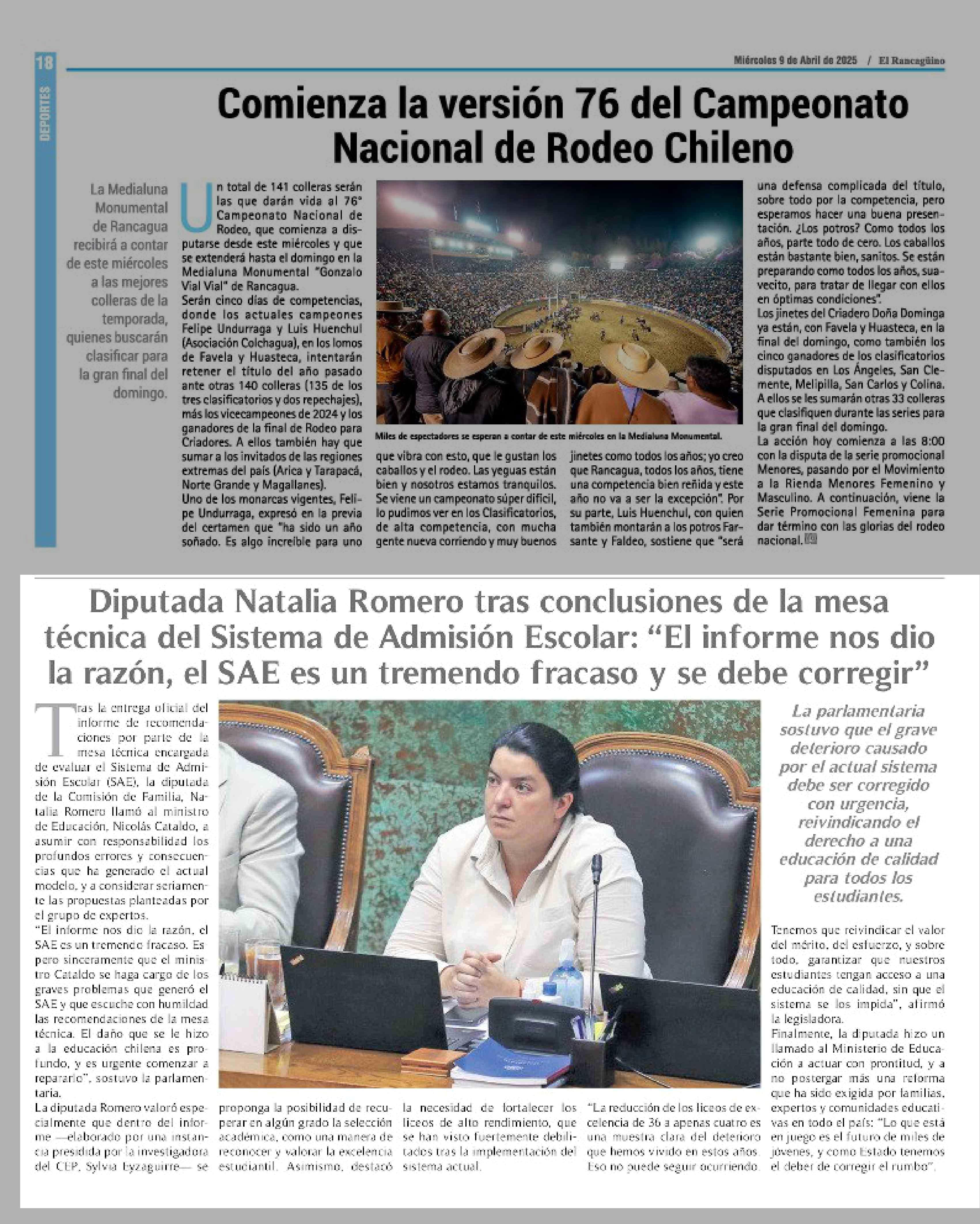 Diputada Natalia Romero tras conclusiones de la mesa técnica del Sistema de Admisión Escolar: “El informe nos dio la razón, el SAE es un tremendo fracaso y se debe corregir” 09-04-2025 El Rancagüino |