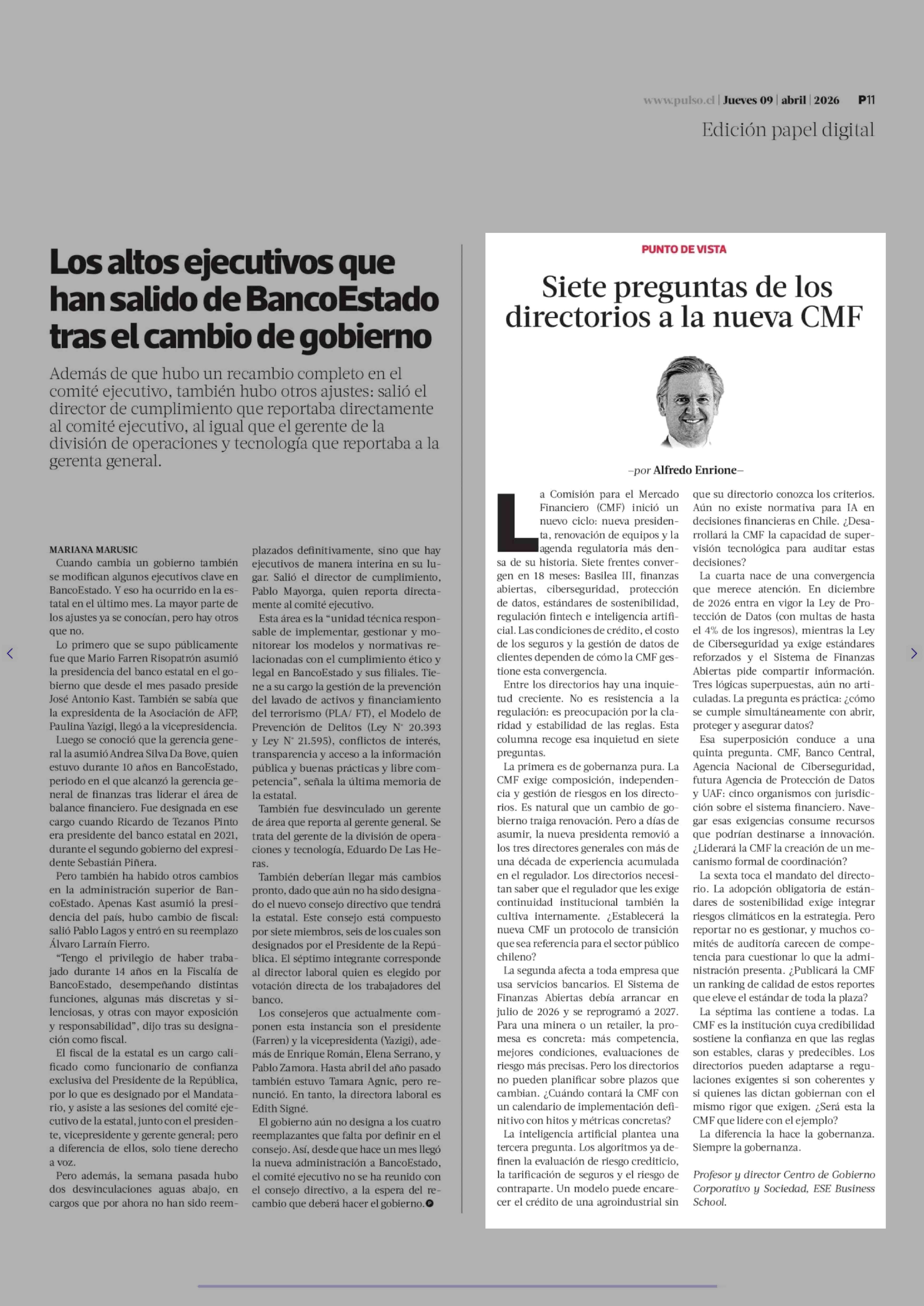 Columnas de Opinión: Siete preguntas de los directorios a la nueva CMF 09-04-2026 La Tercera |