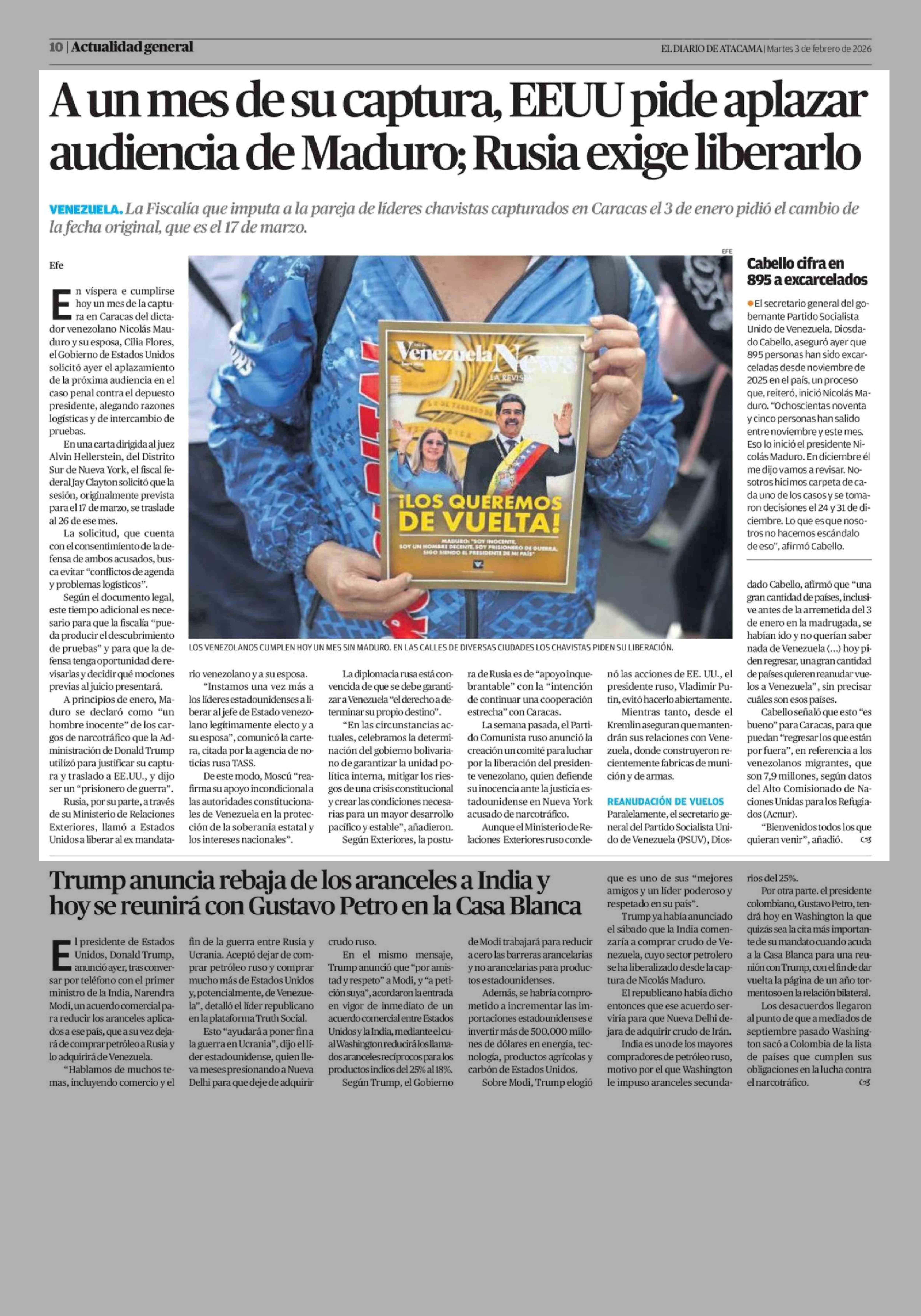 Título: A un mes de su captura, EEUU pide aplazar audiencia de Maduro; Rusia exige liberarlo