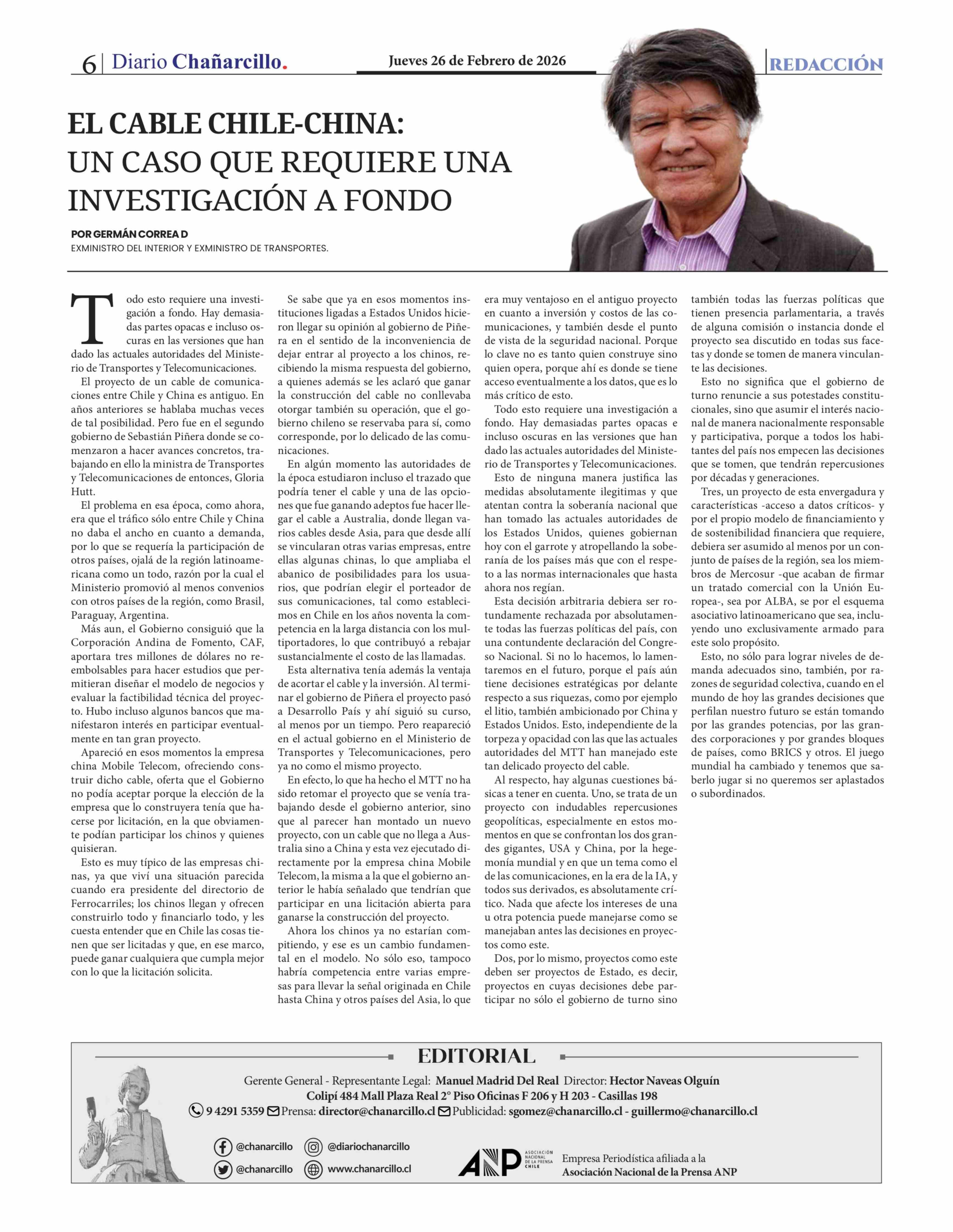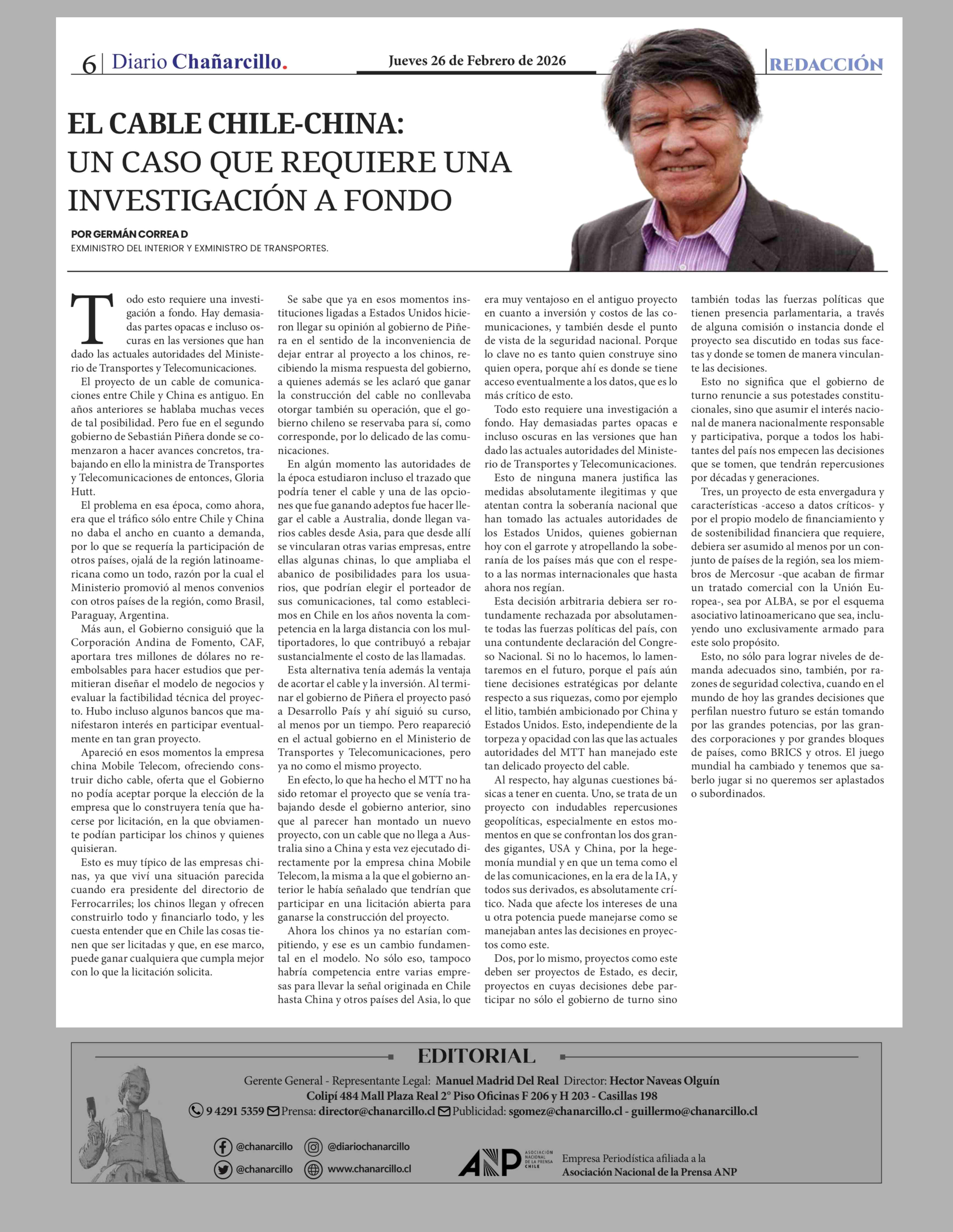 Título: Columnas de Opinión: EL CABLE CHILE-CHINA: UN CASO QUE REQUIERE UNA INVESTIGACIÓN A FONDO