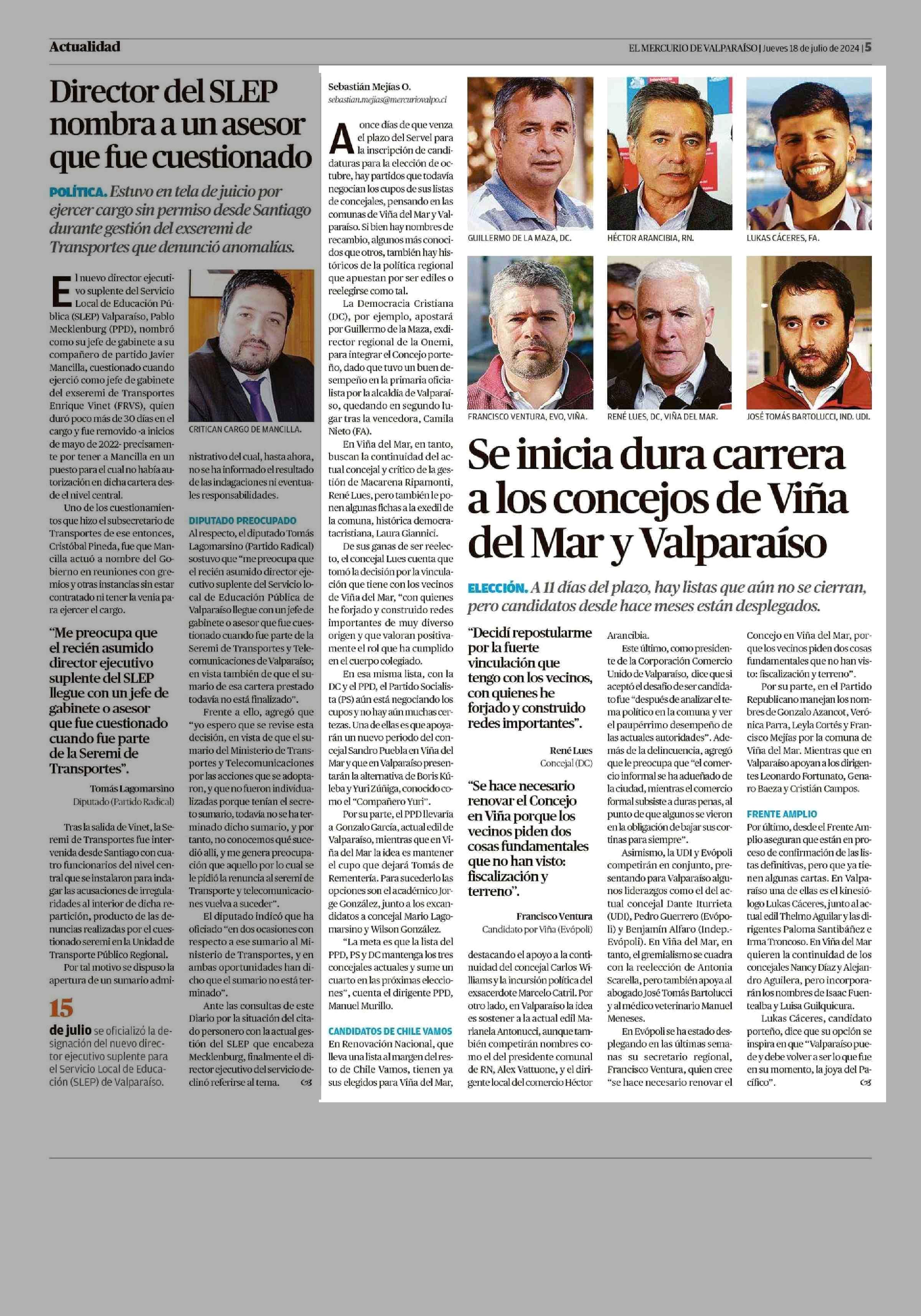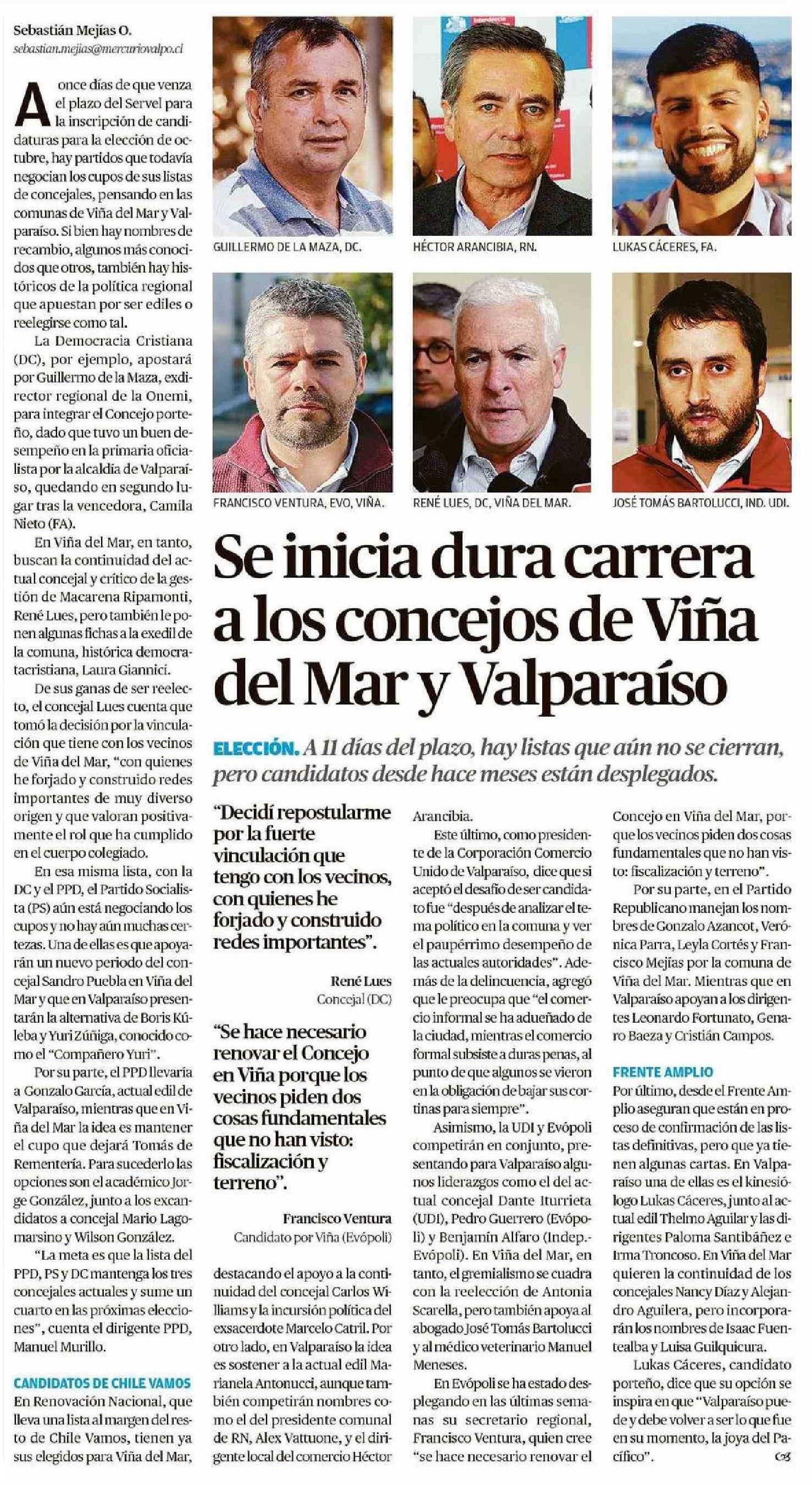 Se inicia dura carrera alos concejos de Viña del Mar y Valparaíso 18-07-2024 El Mercurio de Valparaíso |