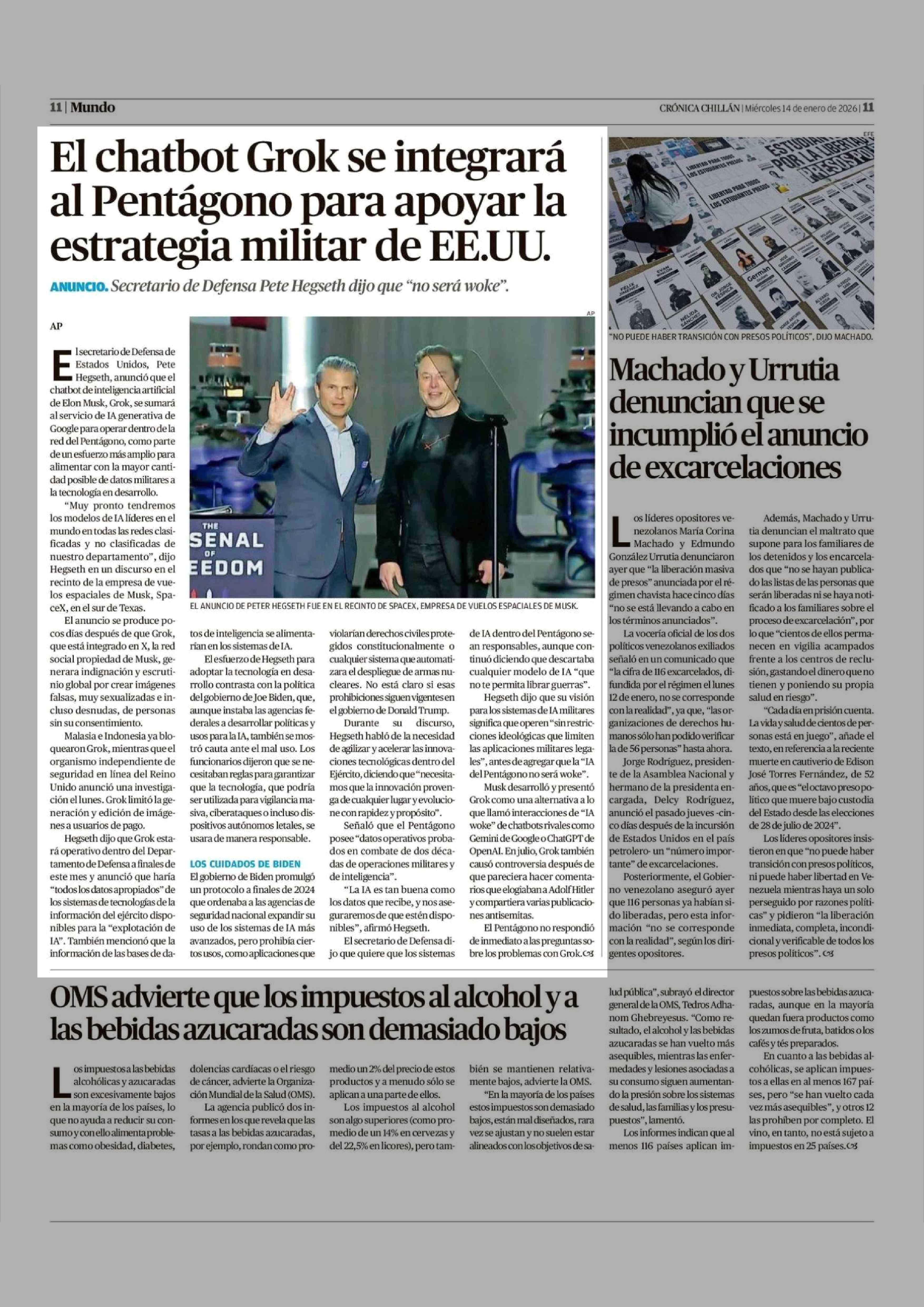 El chatbot Grok se integrará al Pentágono para apoyar la estrategia militar de EE.UU. 14-01-2026 Crónica de Chillán |