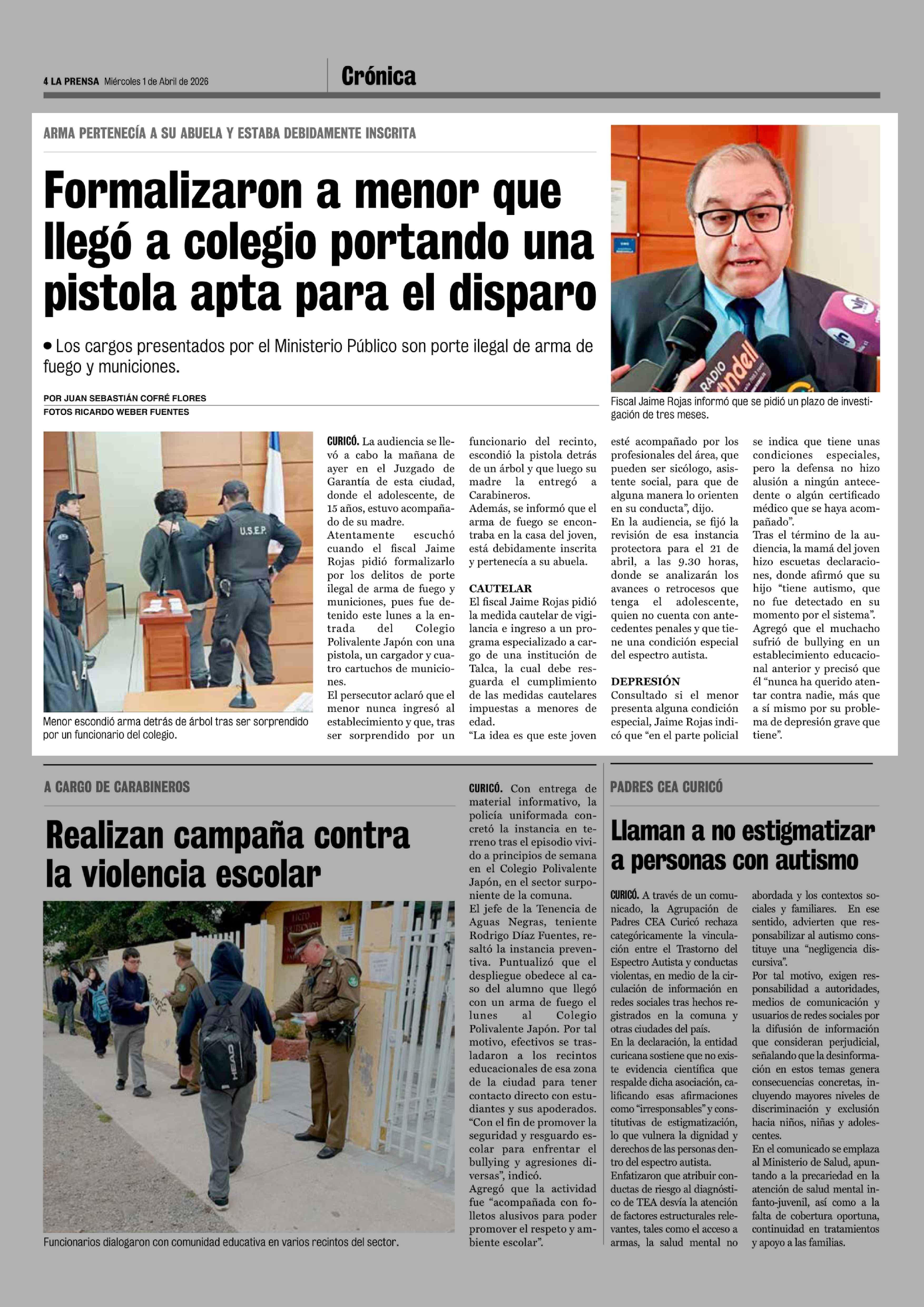 Formalizaron a menor que llegó a colegio portando una pistola apta para el disparo 01-04-2026 La Prensa de Curicó |