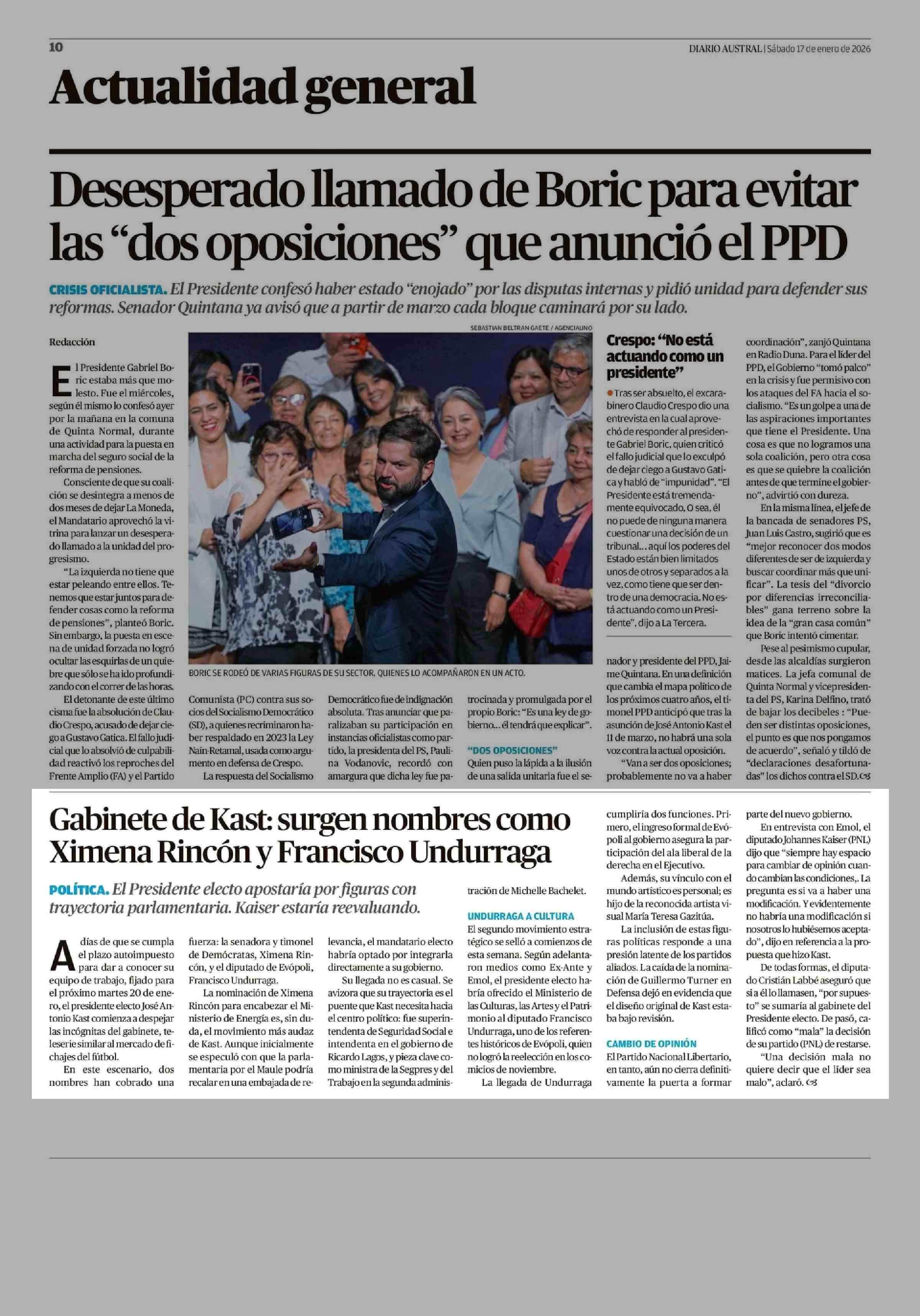 Gabinete de Kast: surgen nombres como Ximena Rincón y Francisco Undurraga 17-01-2026 Diario Austral Región de Los Ríos |