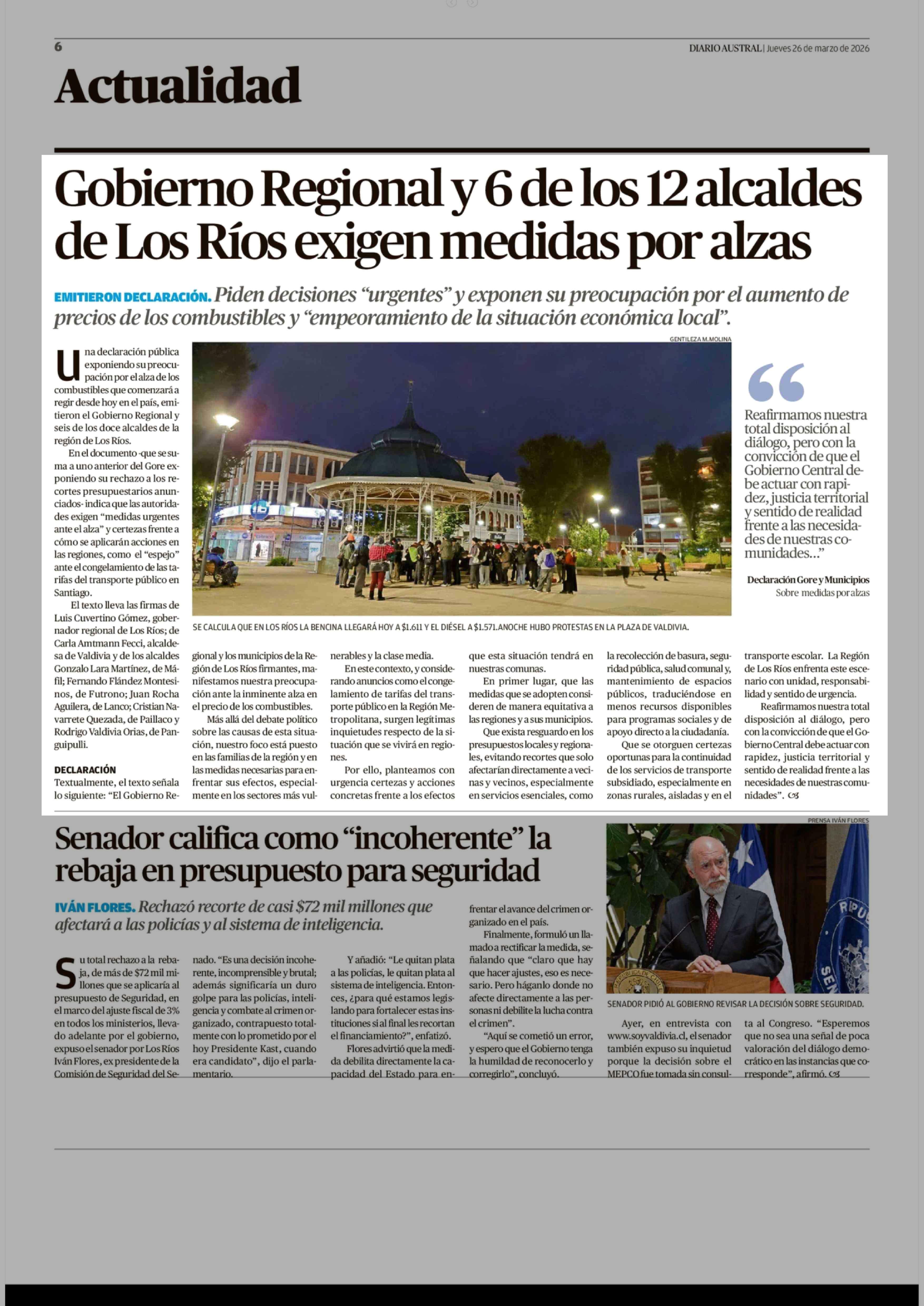 Gobierno Regional y 6 de los 12 alcaldes de Los Ríos exigen medidas por alzas 26-03-2026 Diario Austral Región de Los Ríos |