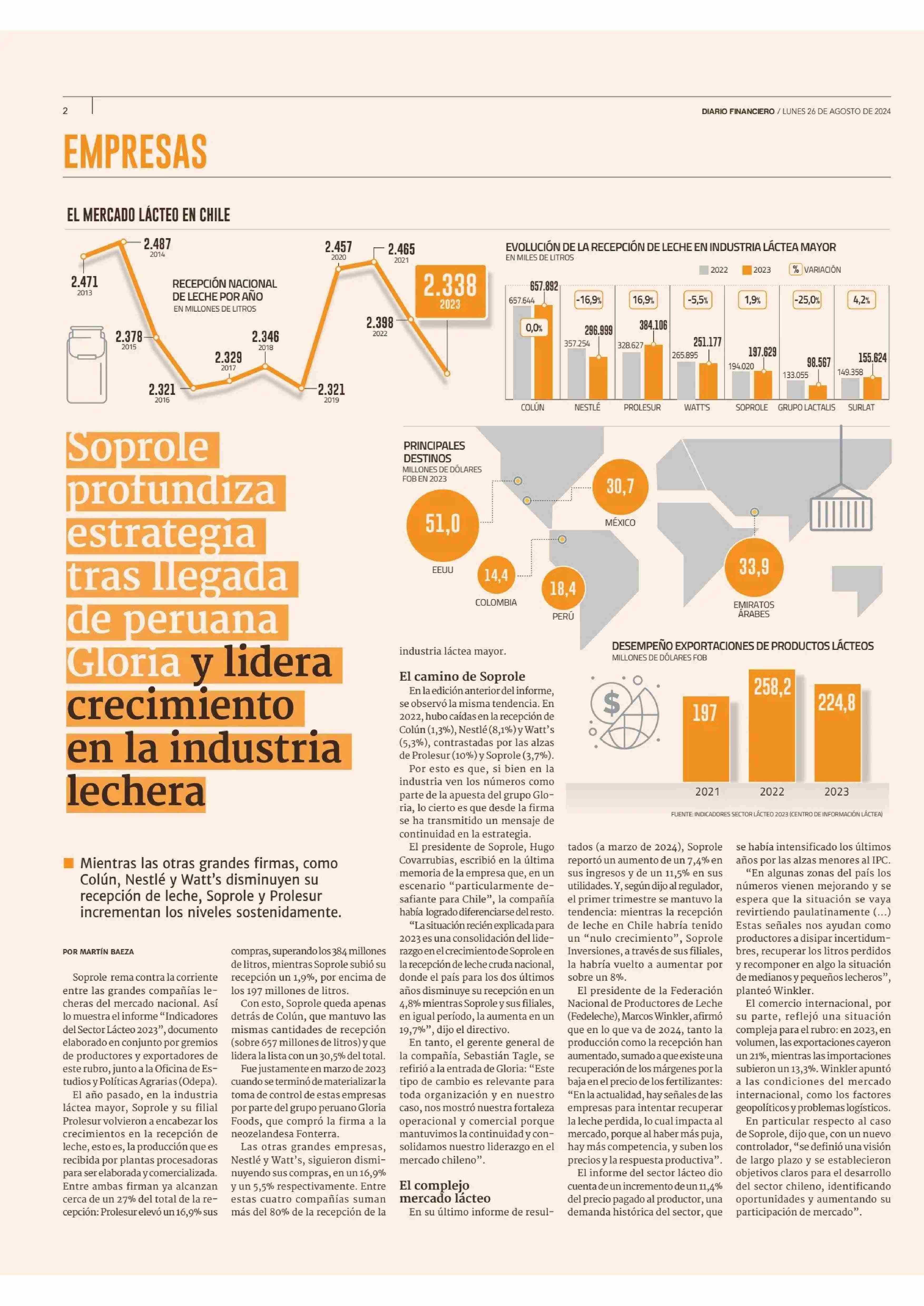 Soprole profundiza estrategia tras llegada de peruana gloria y lidera crecimiento en la industria lechera 26-08-2024 Diario Financiero |