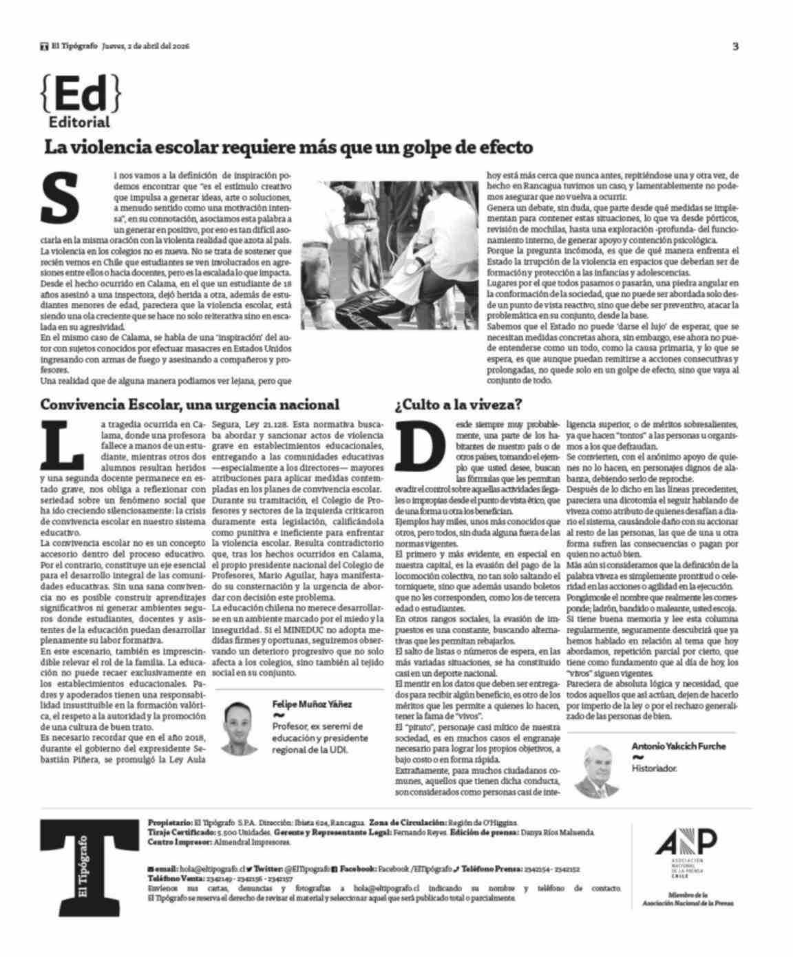 Columnas de Opinión: Convivencia Escolar, una urgencia nacional 02-04-2026 El Tipógrafo |