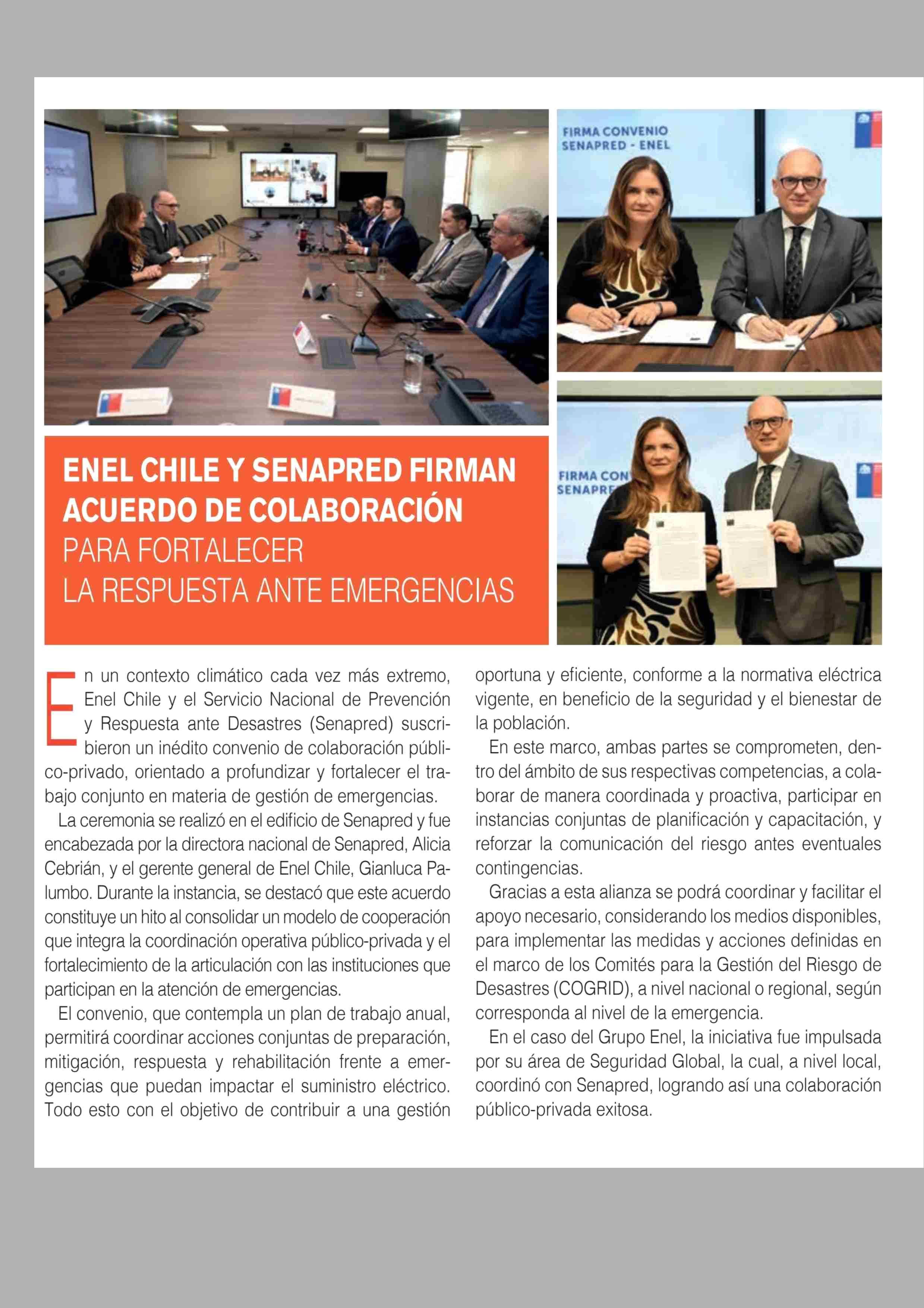 | Título: | ENEL CHILE Y SENAPRED FIRMAN ACUERDO DE COLABORACIÓN PARA FORTALECER LA RESPUESTA ANTE EMERGENCI |