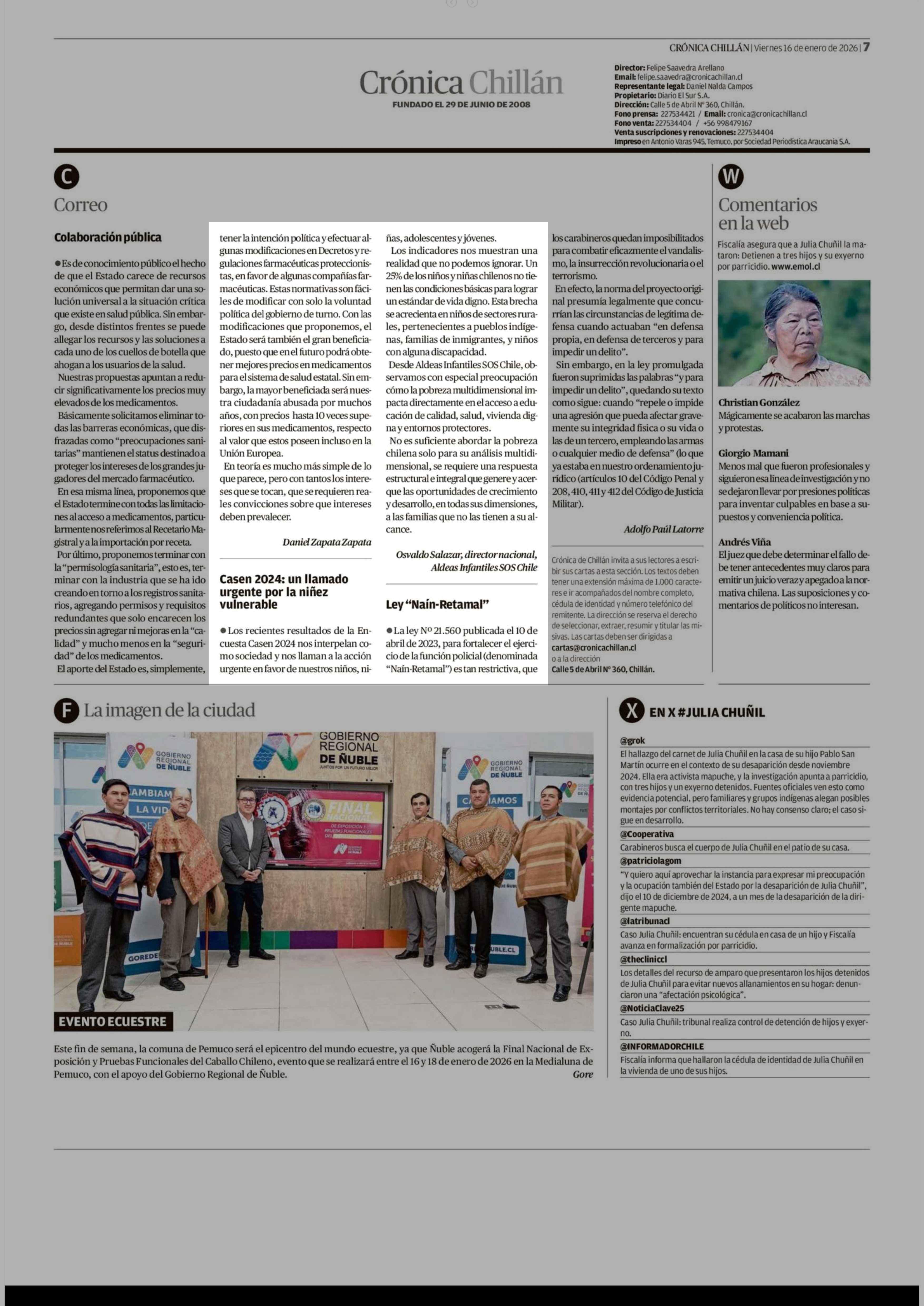 Cartas: Casen 2024: un llamado urgente por la niñez vulnerable 16-01-2026 Crónica de Chillán |