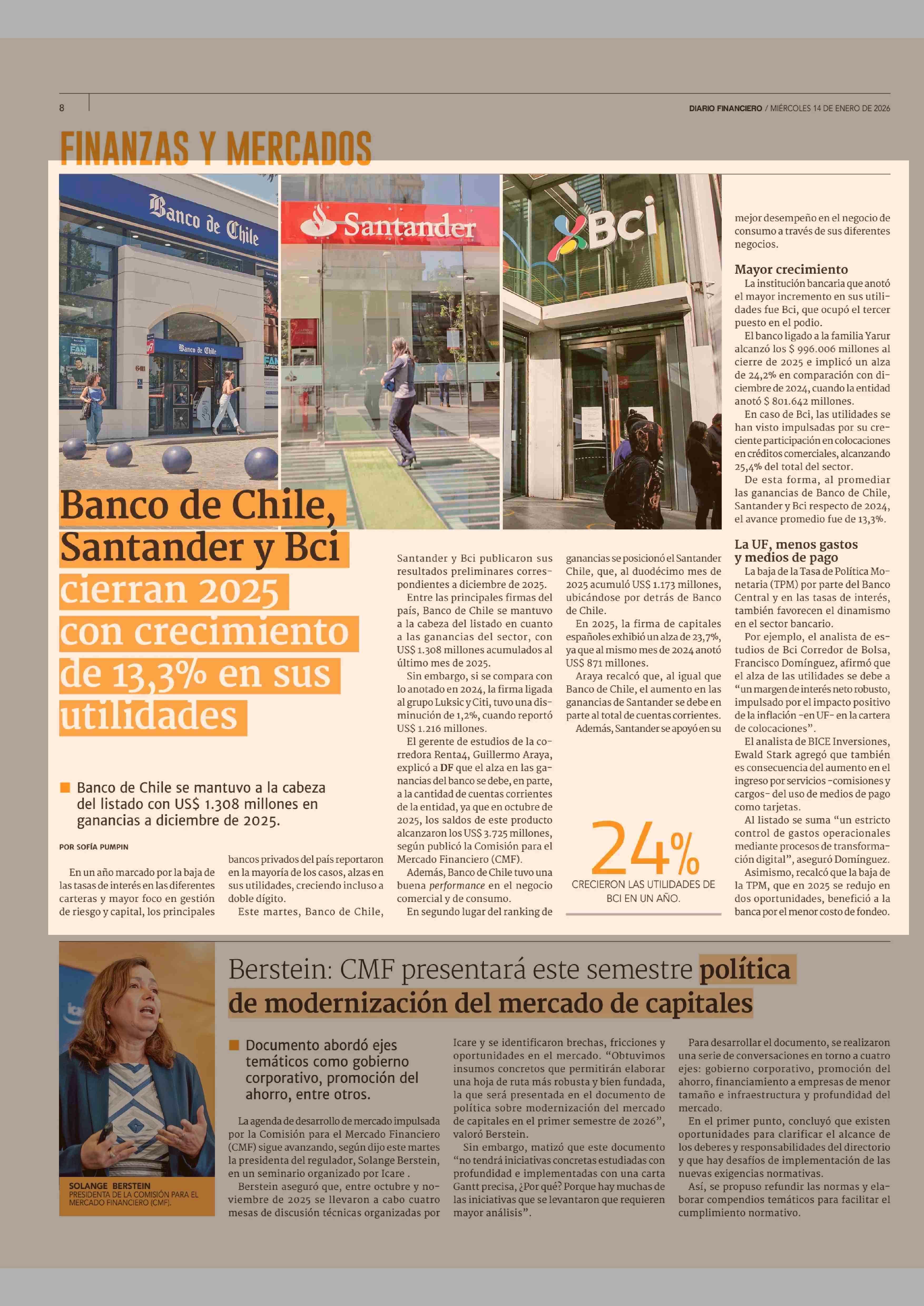 Título: Banco de Chile, Santander y Bci Cierran 2025 con crecimiento de 13,3% en sus utilidades