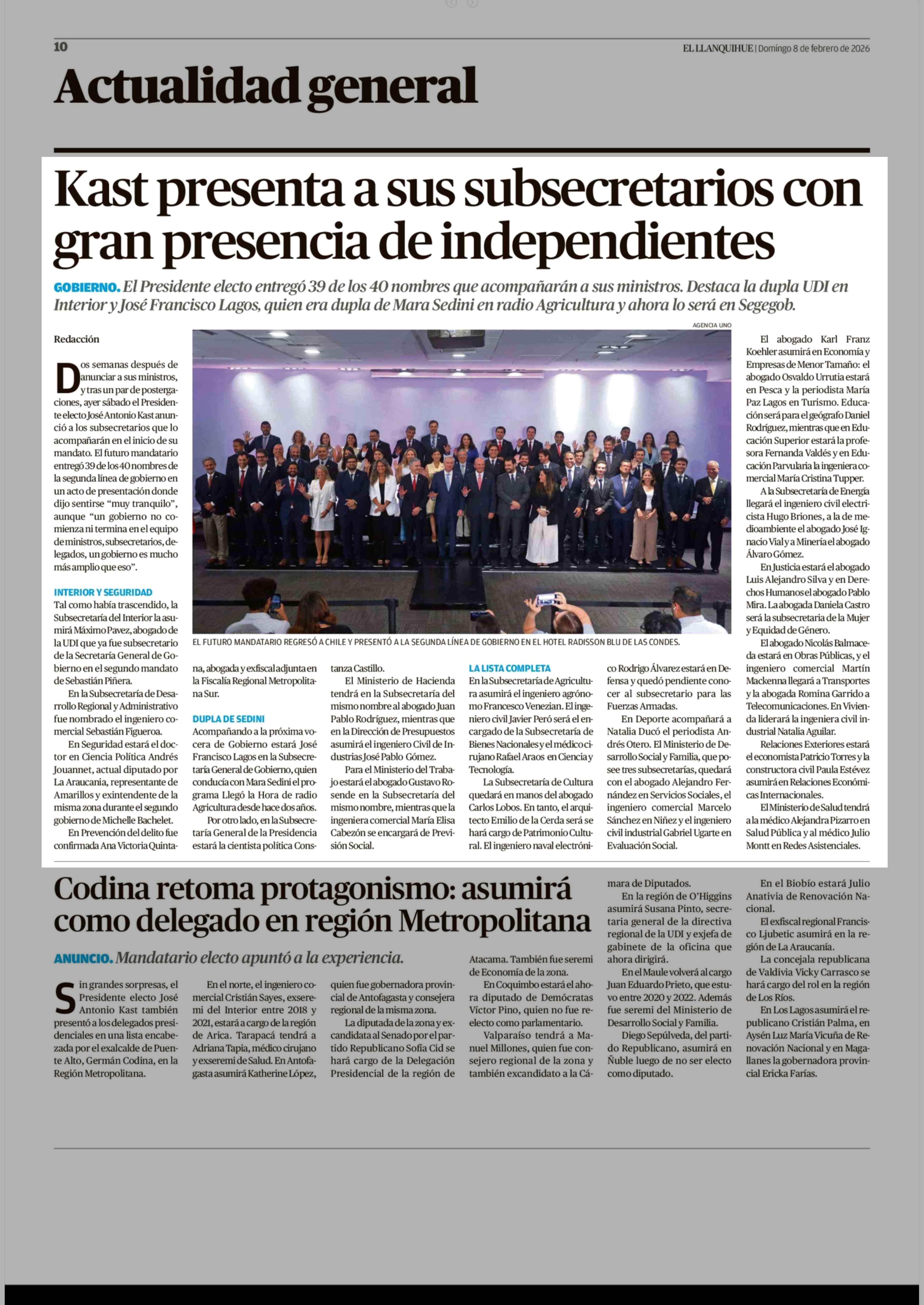 | Título: | Kast presenta a sus subsecretarios con gran presencia de independientes |