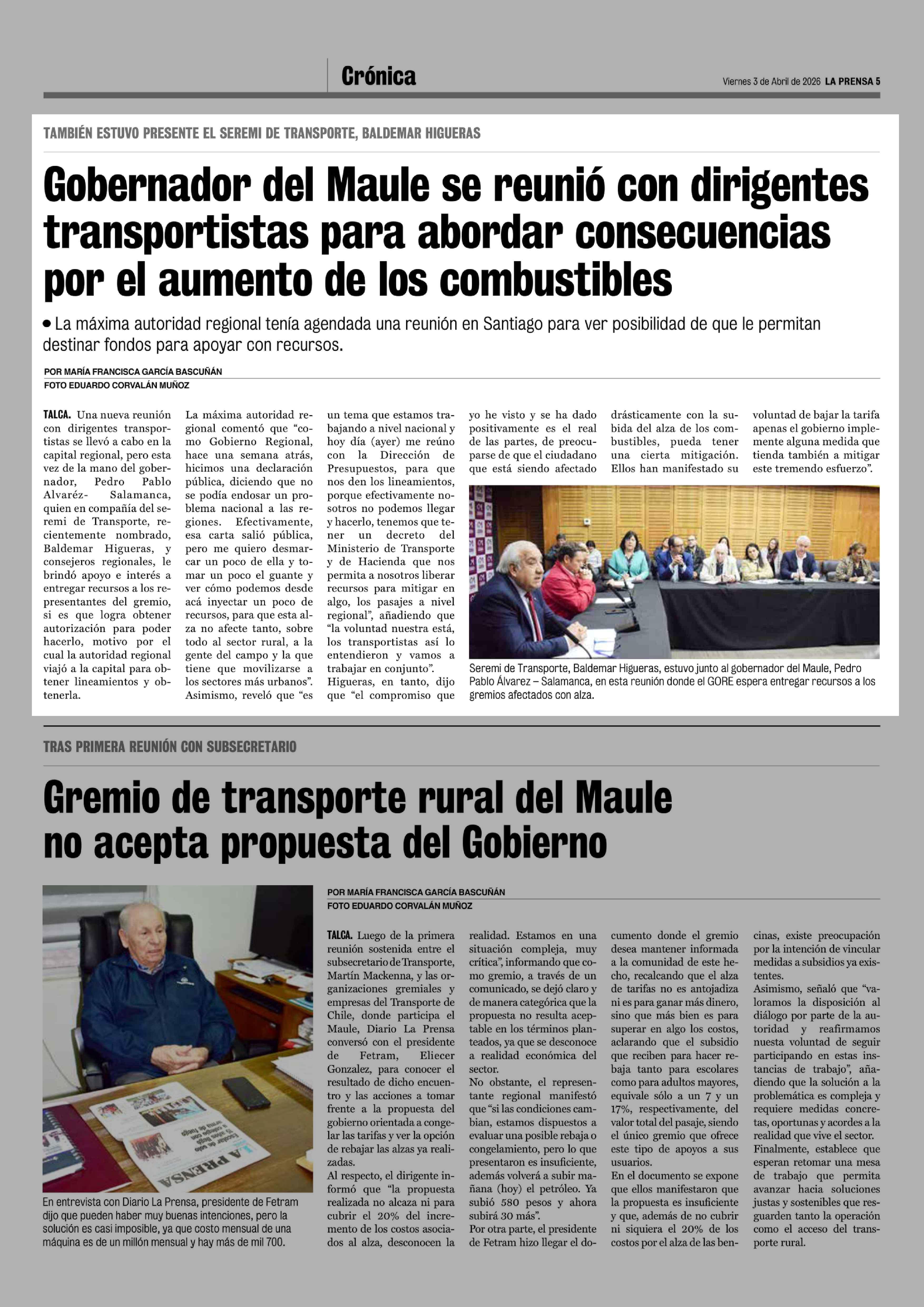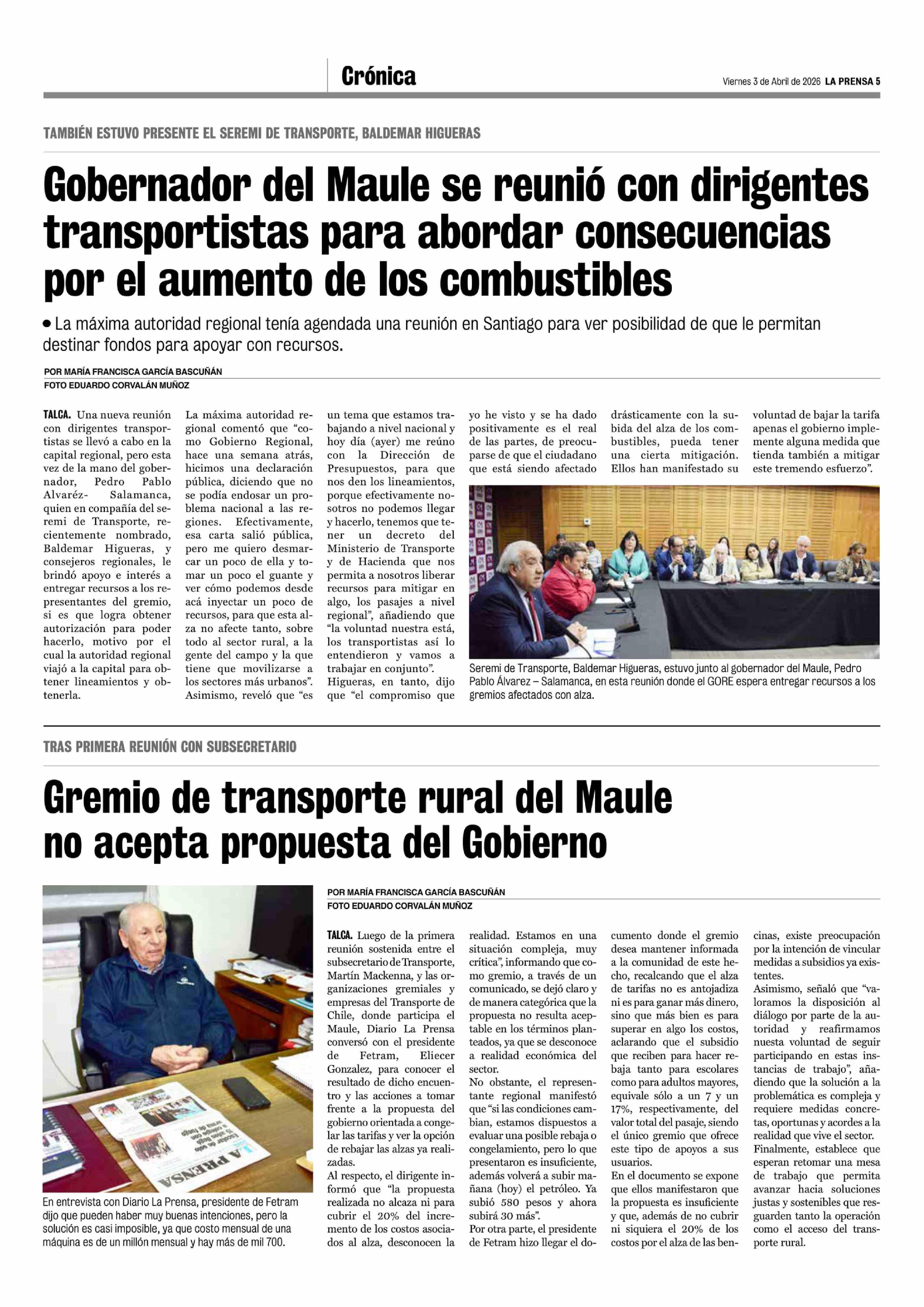 Gobernador del Maule se reunió con dirigentes transportistas para abordar consecuencias por el aumento de los combustibles 03-04-2026 La Prensa de Curicó |