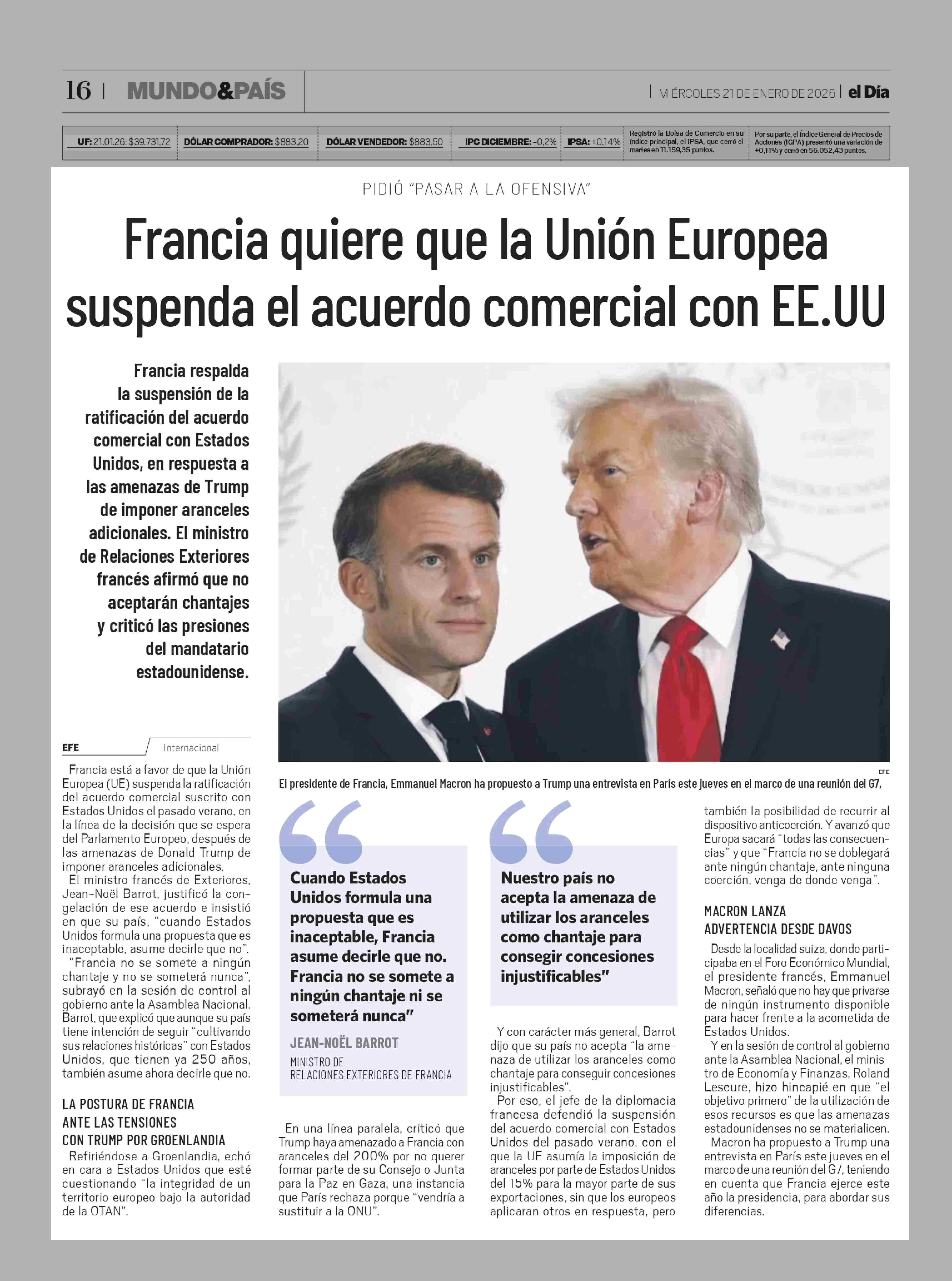 Francia quiere que la Unión Europea suspenda el acuerdo comercial con EE.UU 21-01-2026 El Día |