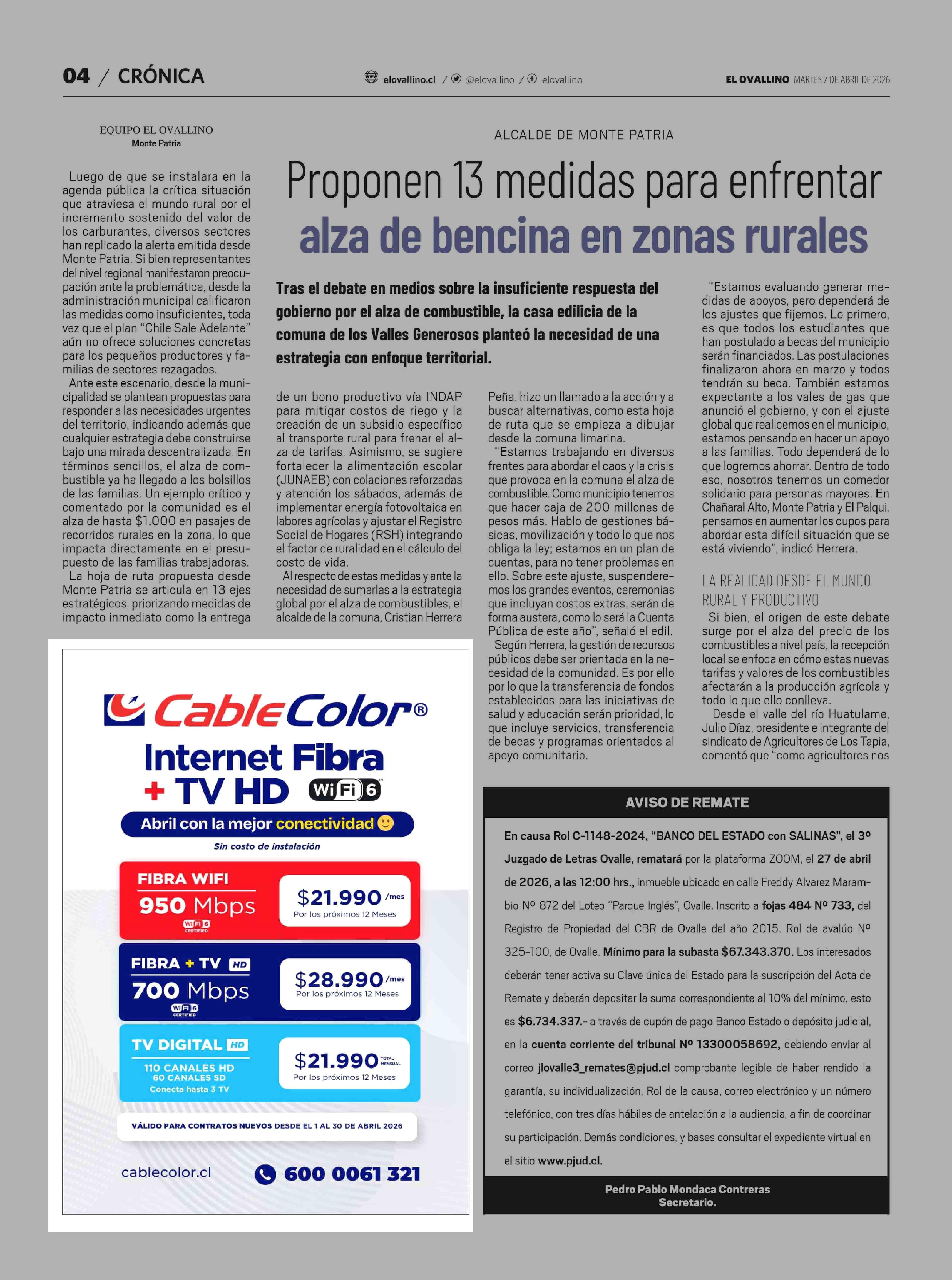 AVISO TELECOMUNICACIONES: CABLE COLOR 07-04-2026 El Ovallino |