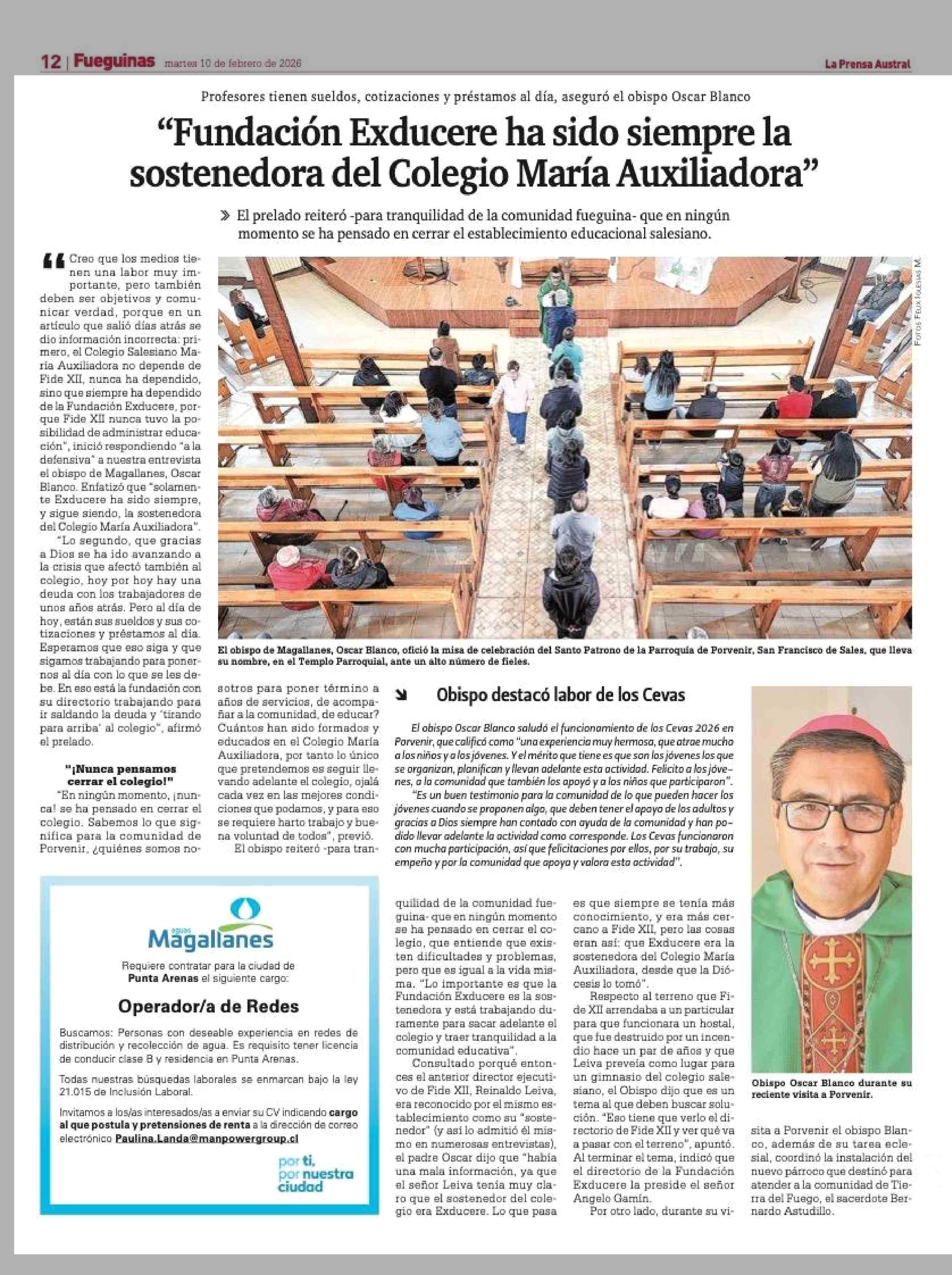 “Fundación Exducere ha sido siempre la sostenedora del Colegio María Auxiliadora” 10-02-2026 La Prensa Austral |