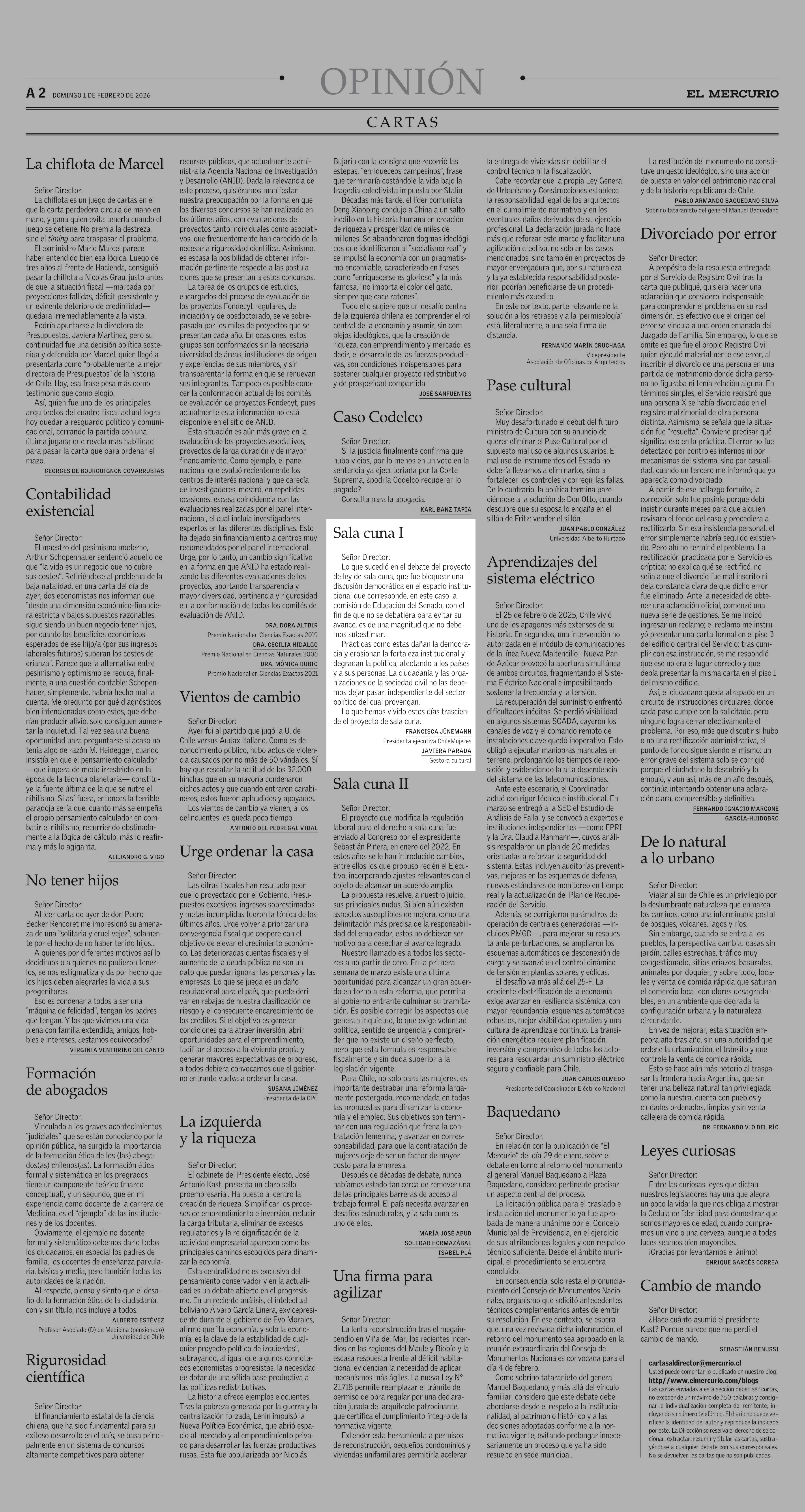 Cartas: Sala cuna I 01-02-2026 El Mercurio |
