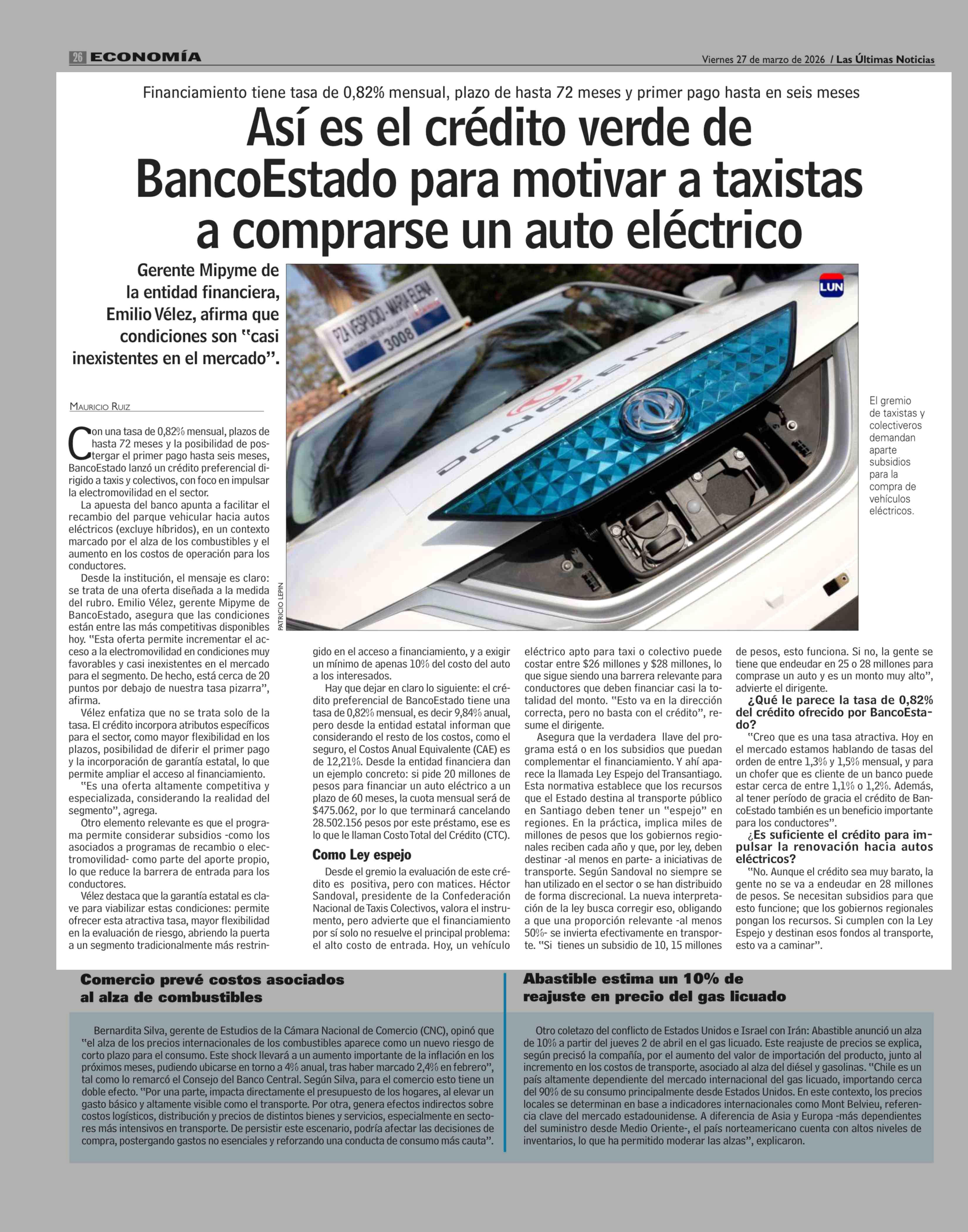 Así es el crédito verde de BancoEstado para motivar a taxistas a comprarse un auto eléctrico 27-03-2026 Las Últimas Noticias |