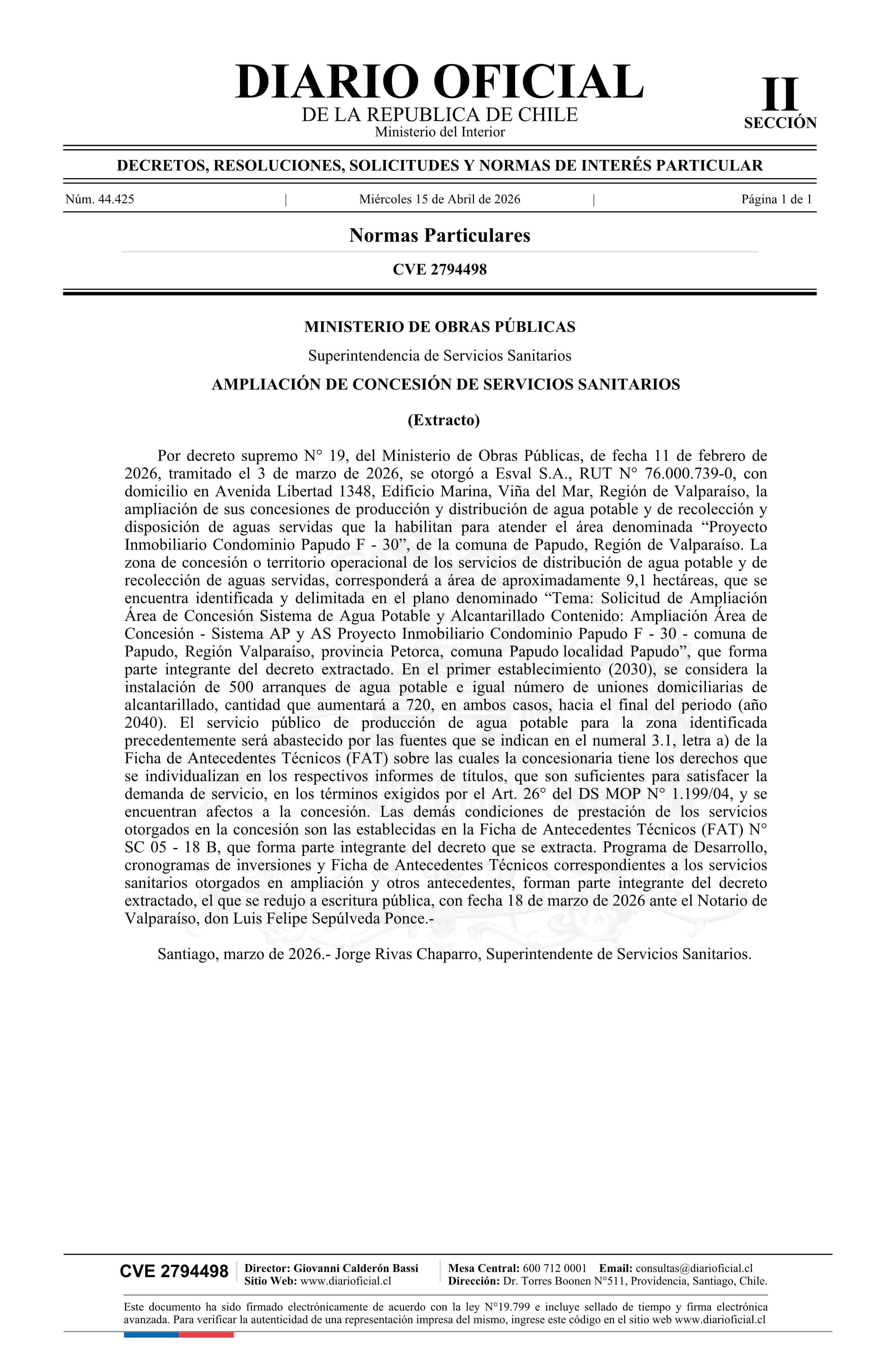 Extracto de otorgamiento de ampliación de concesión de servicios sanitarios de producción y distribución de agua potable y recolección y disposición de aguas servidas 15-04-2026 Diario Oficial Edición Electrónica |