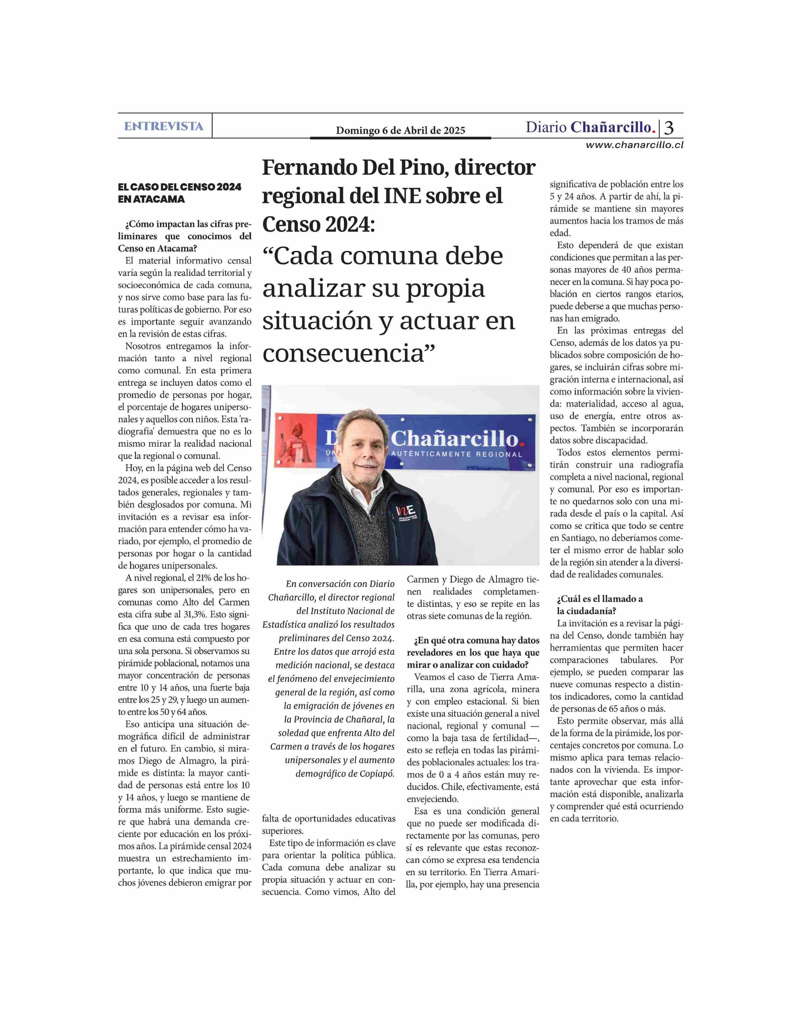 Fernando Del Pino, director regional del INE sobre el Censo 2024: “Cada comuna debe analizar su propia situación y actuar en consecuencia” =3 06-04-2025 Diario Chañarcillo |