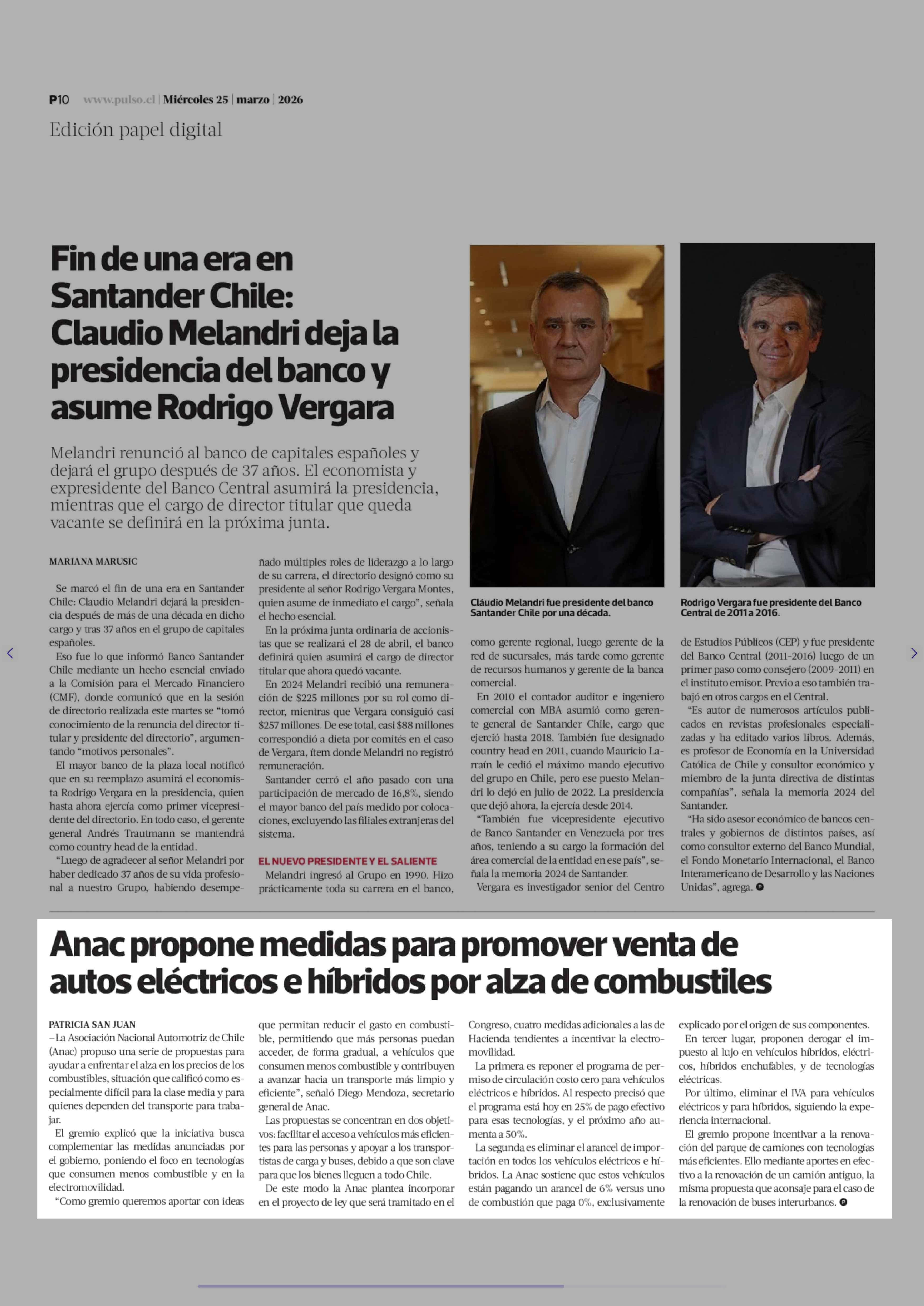 Anac propone medidas para promover venta de autos eléctricos e híbridos por alza de combustiles 25-03-2026 La Tercera |
