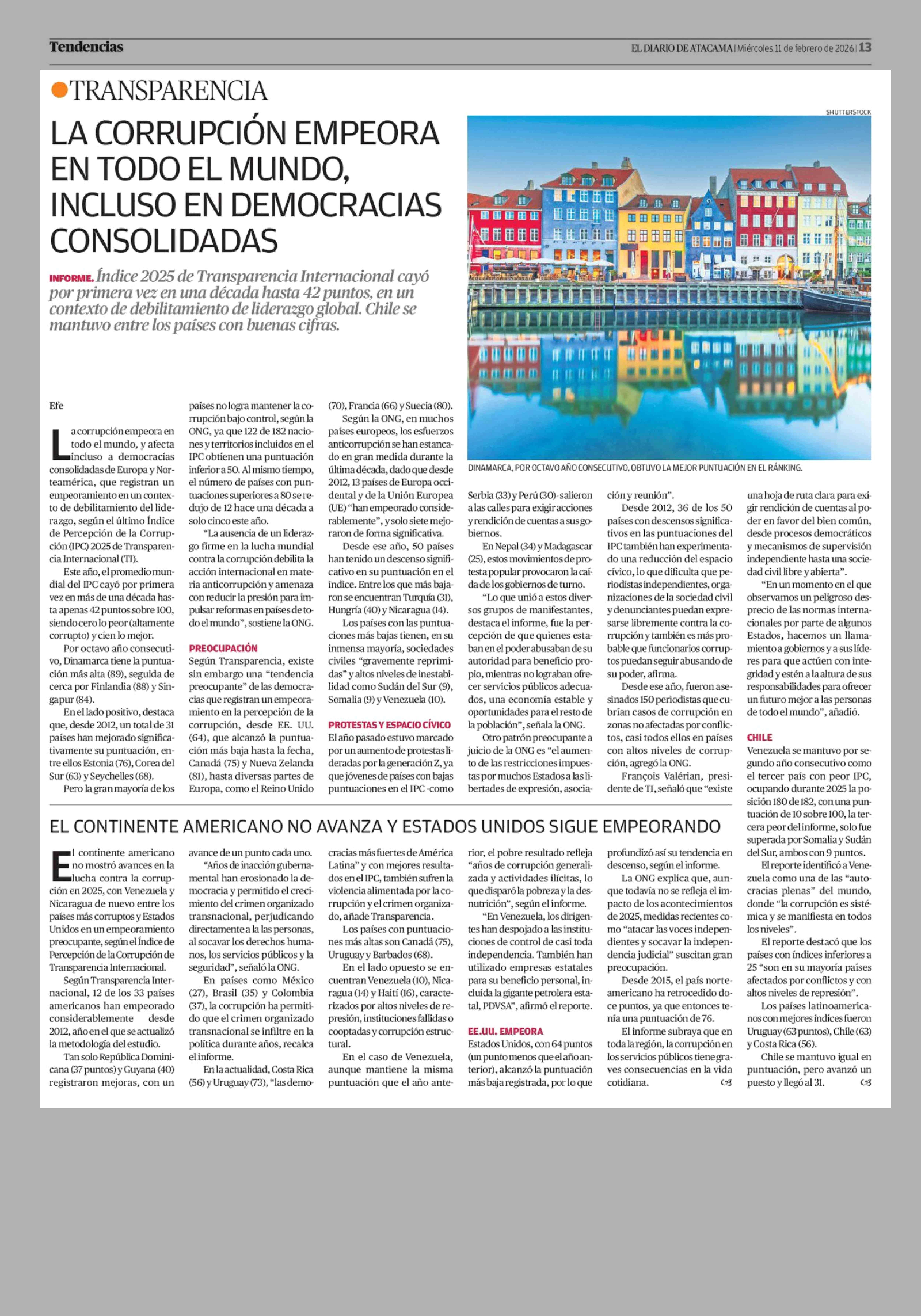 LA CORRUPCIÓN EMPEORA EN TODO EL MUNDO, INCLUSO EN DEMOCRACIAS CONSOLIDADAS 11-02-2026 El Diario de Atacama |