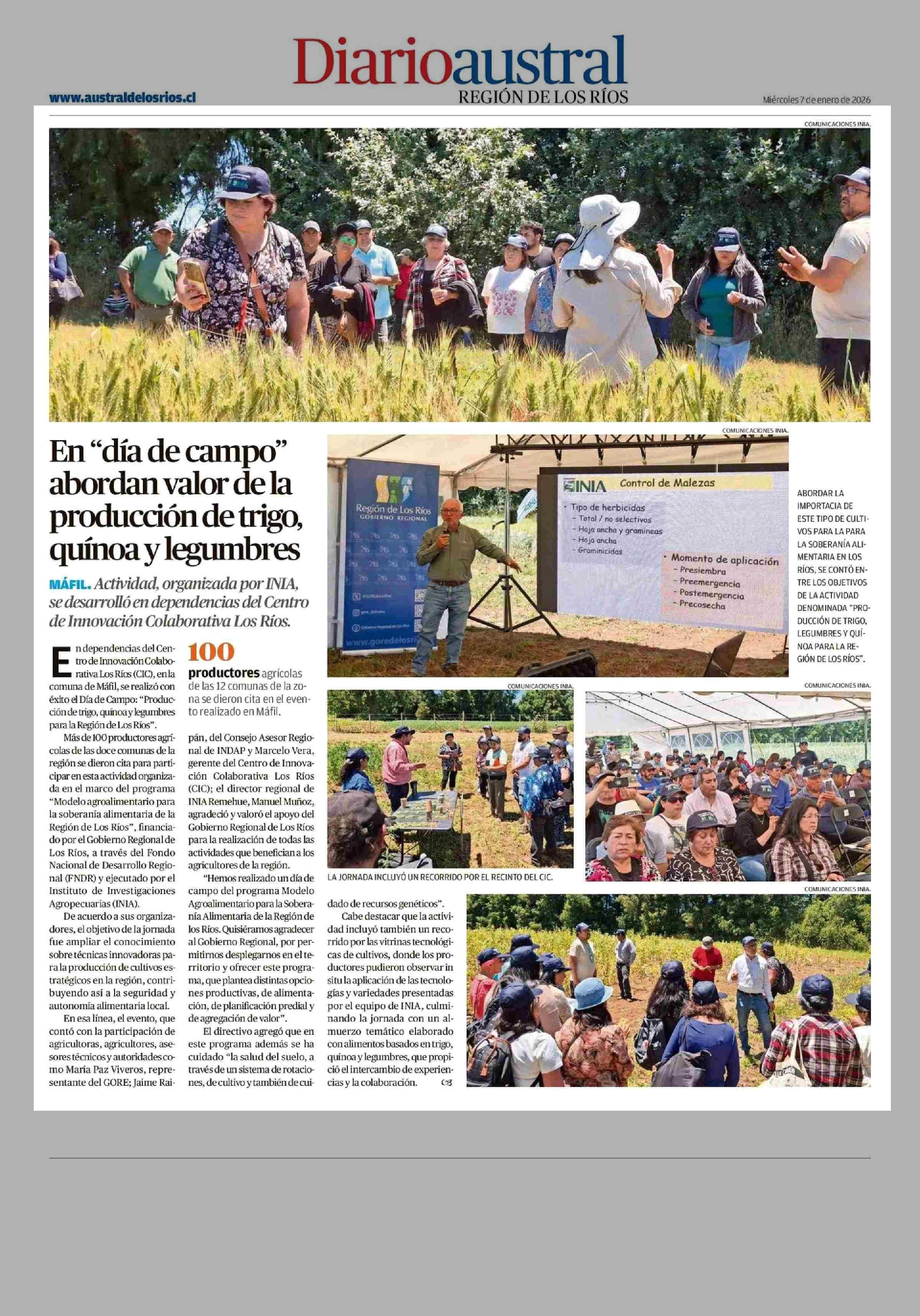 En "día de campo" abordan valor de la producción de trigo, quínoa y legumbres 07-01-2026 Diario Austral Región de Los Ríos |