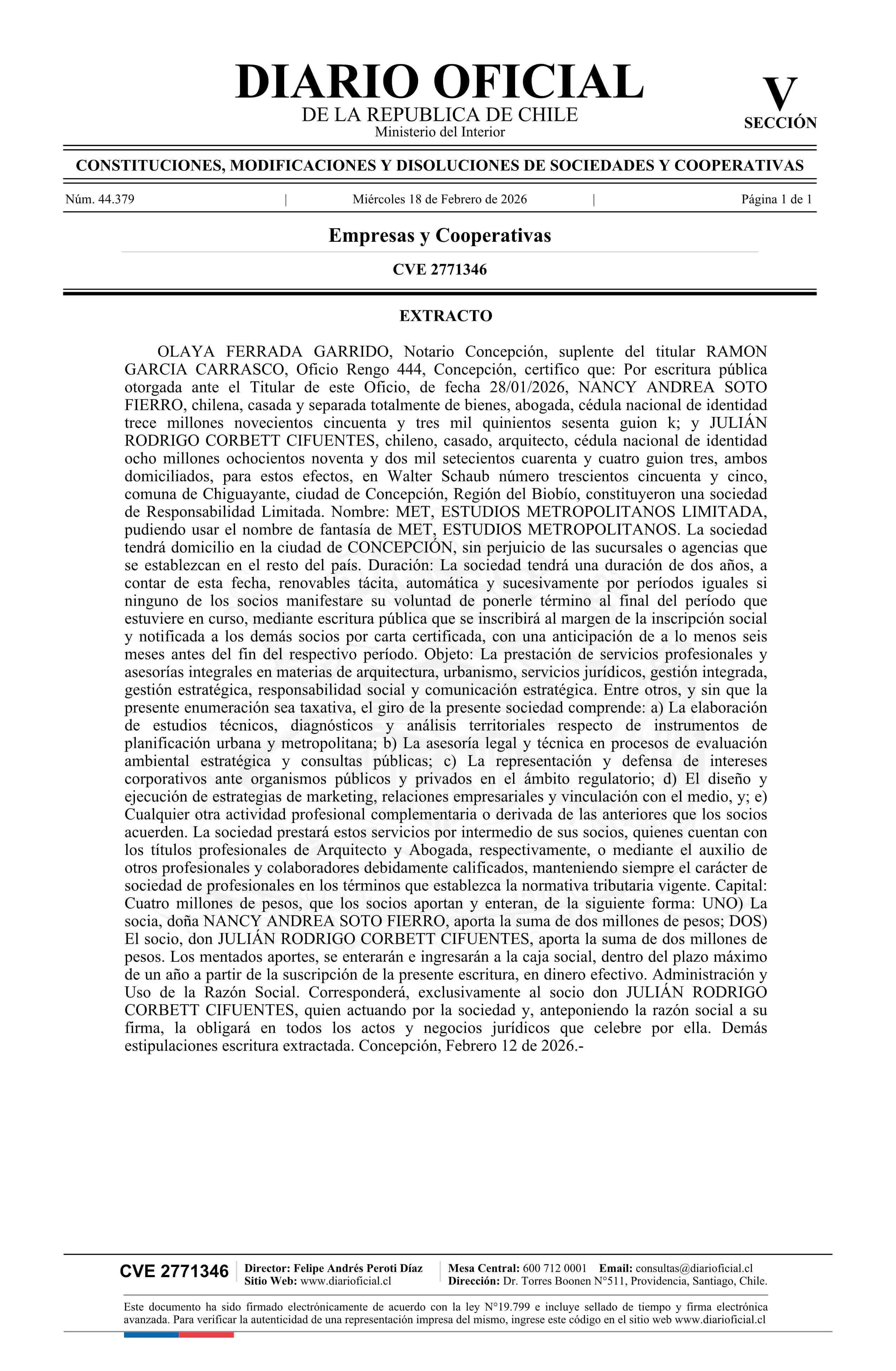 MET, ESTUDIOS METROPOLITANOS LIMITADA 18-02-2026 Diario Oficial Edición Electrónica |