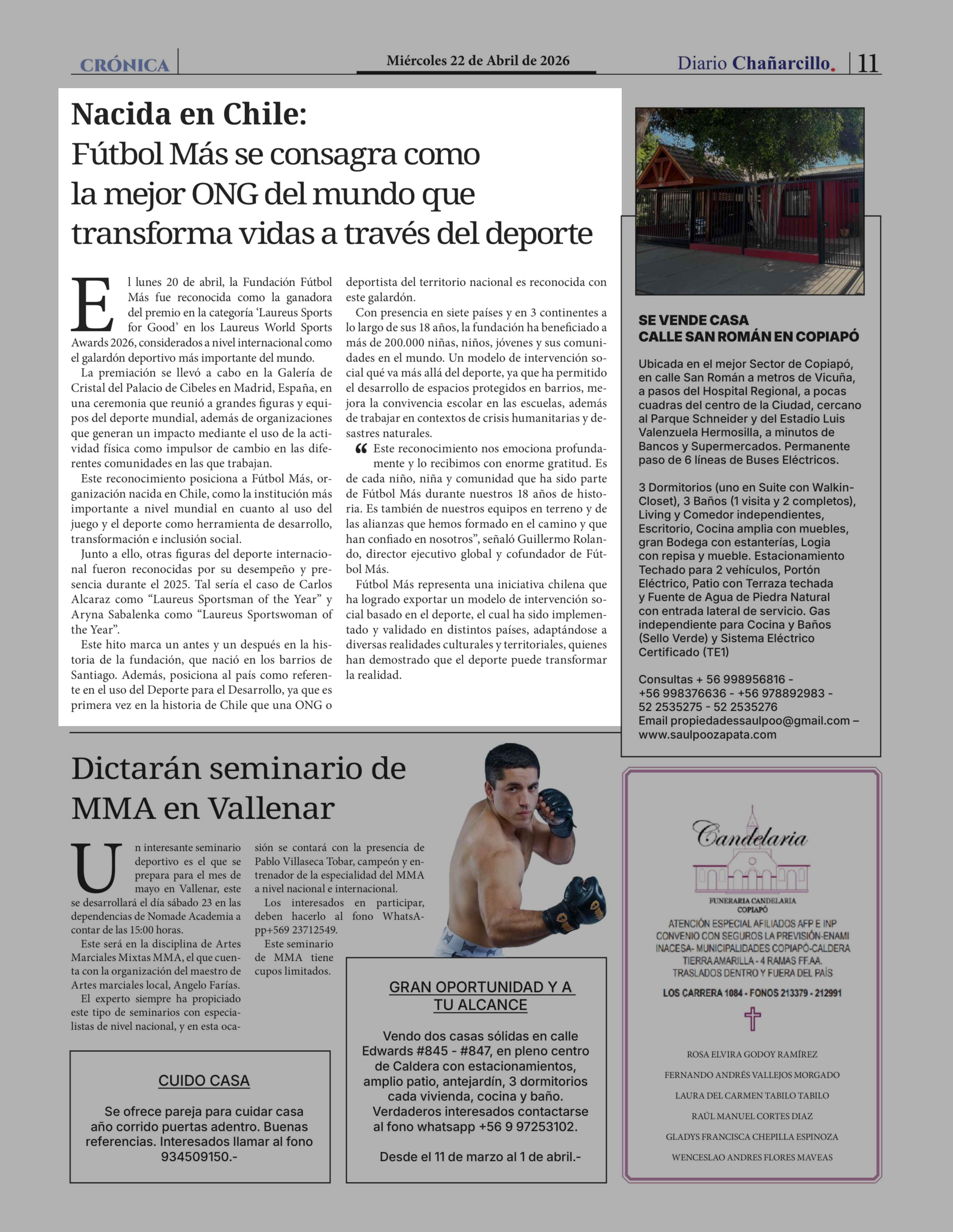 Nacida en Chile: Fútbol Más se consagra como la mejor ONG del mundo que transforma vidas a través del deporte 22-04-2026 Diario Chañarcillo |