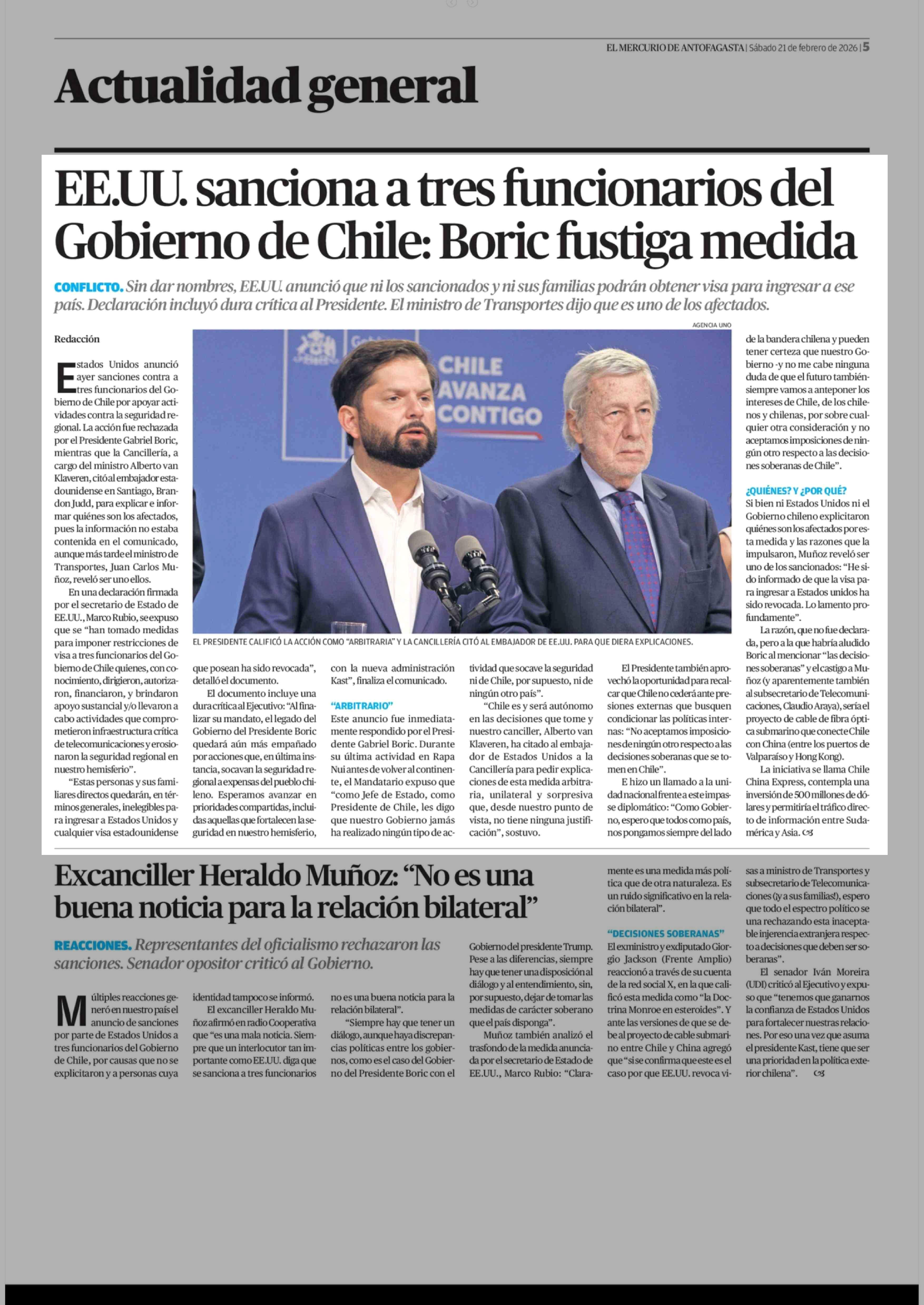 EE.UU. sanciona a tres funcionarios del Gobierno de Chile: Boric fustiga medida 21-02-2026 El Mercurio de Antofagasta |