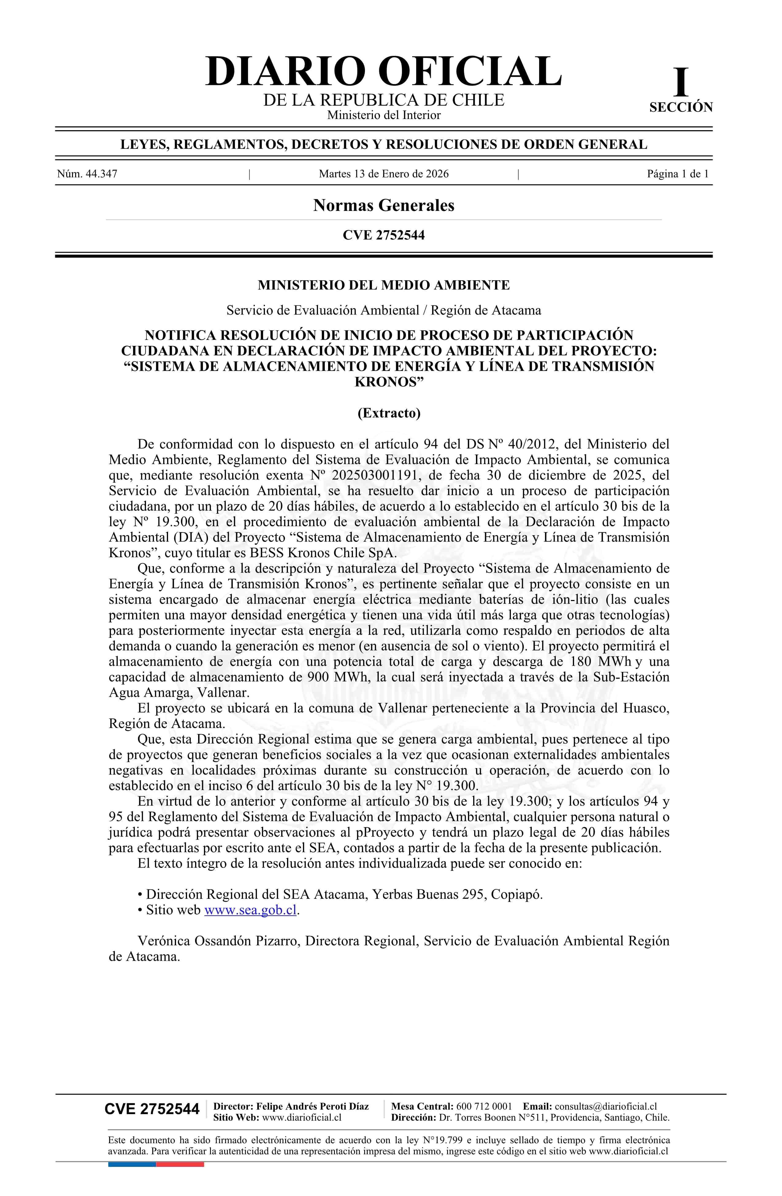 Extracto de resolución exenta número 202503001191, de 2025.- Inicia proceso de participación ciudadana en Declaración de Impacto Ambiental del proyecto Sistema de Almacenamiento de Energía y Línea de Transmisión Kronos 13-01-2026 DIARIO OFICIAL CHILE - BOLETÍN OFICIAL DE MINERÍA |