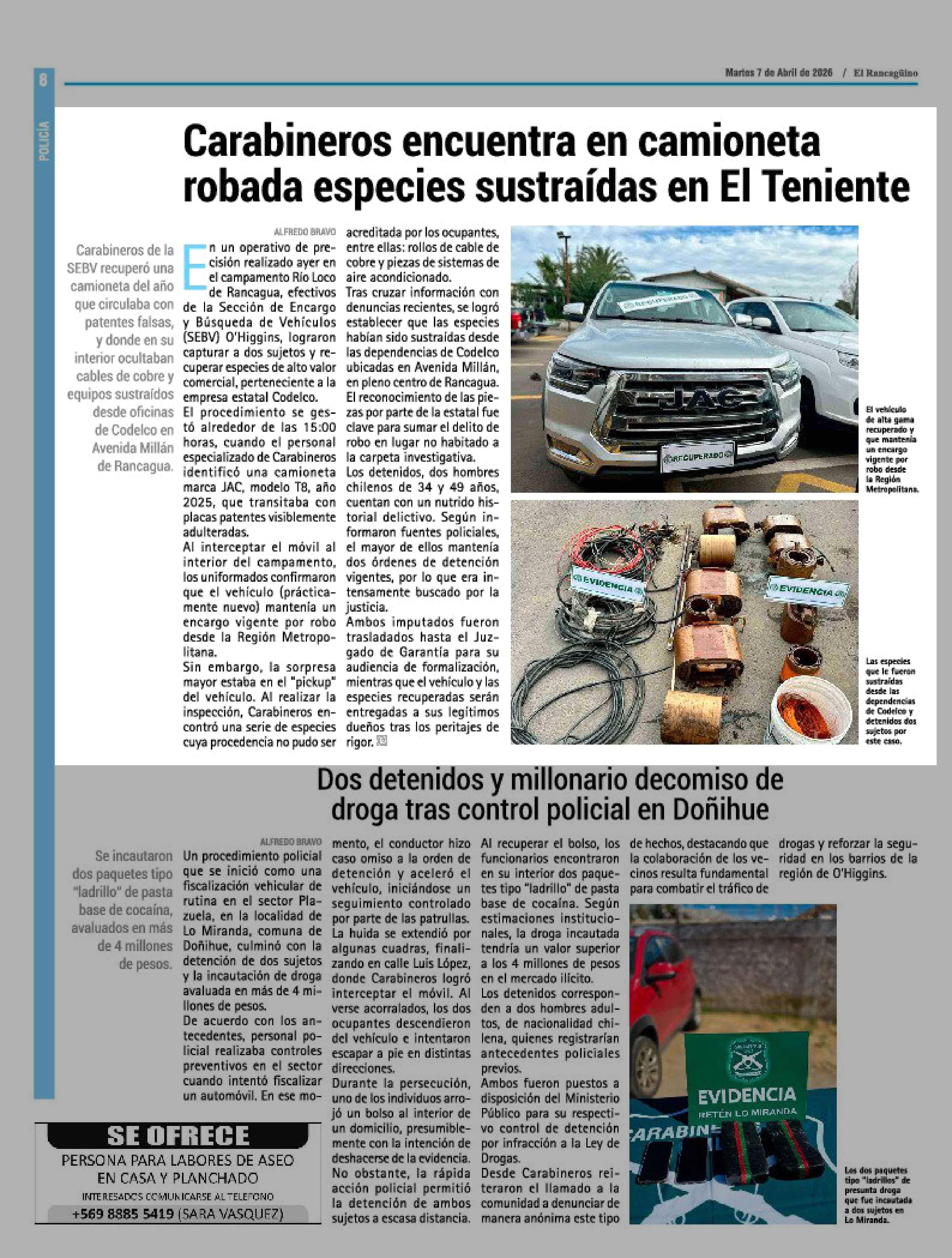 Carabineros encuentra en camioneta robada especies sustraídas en El Teniente 07-04-2026 El Rancagüino |