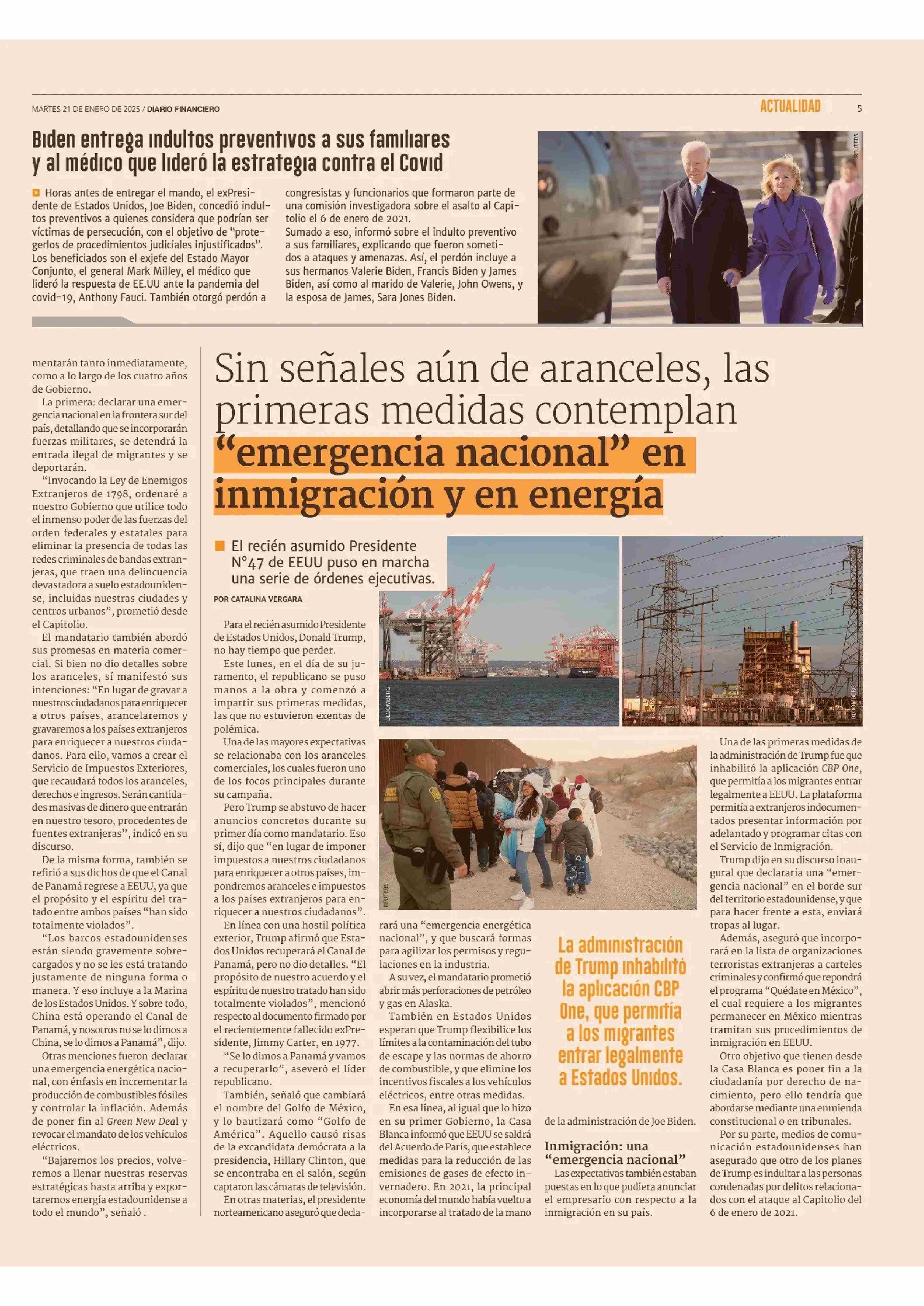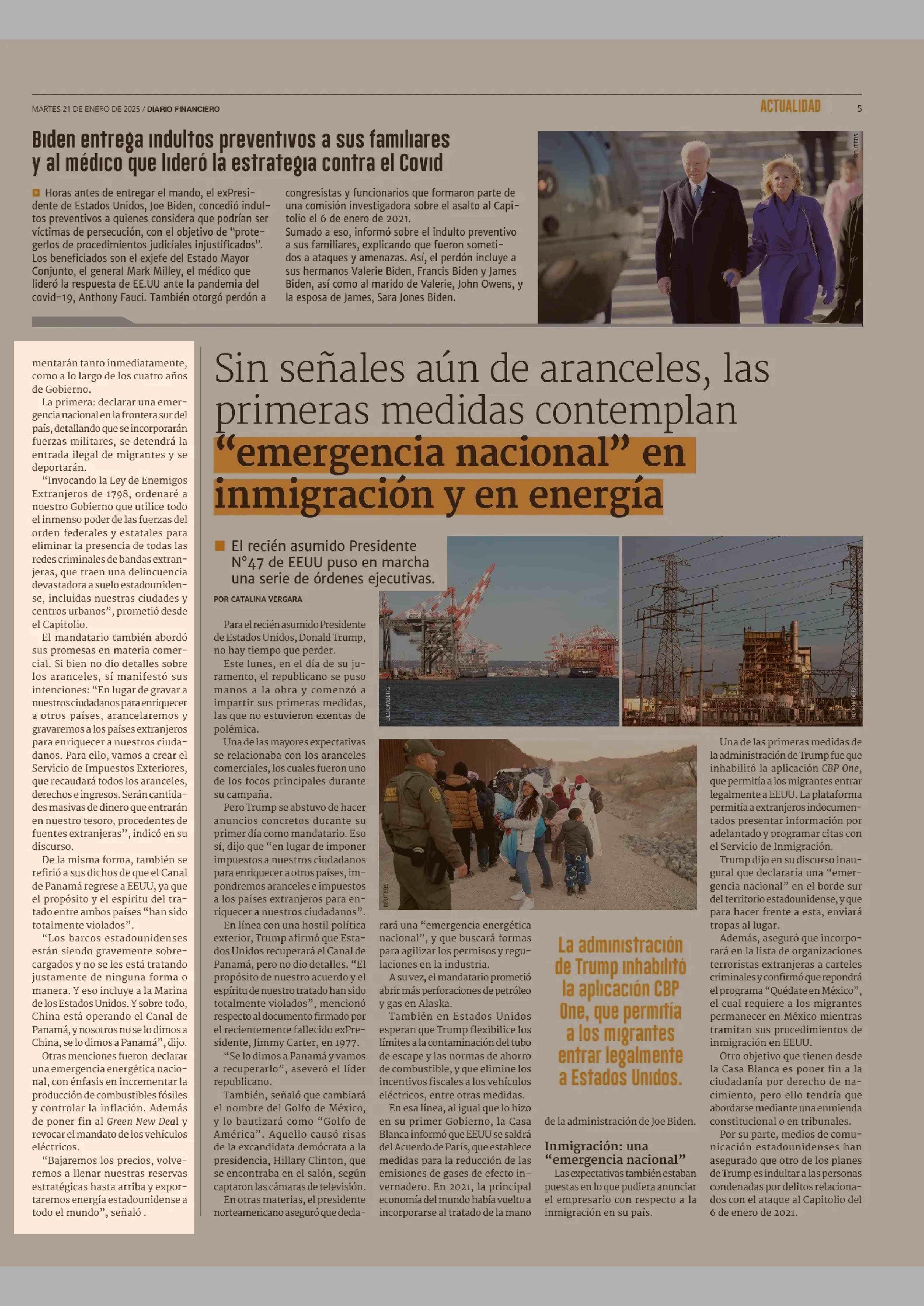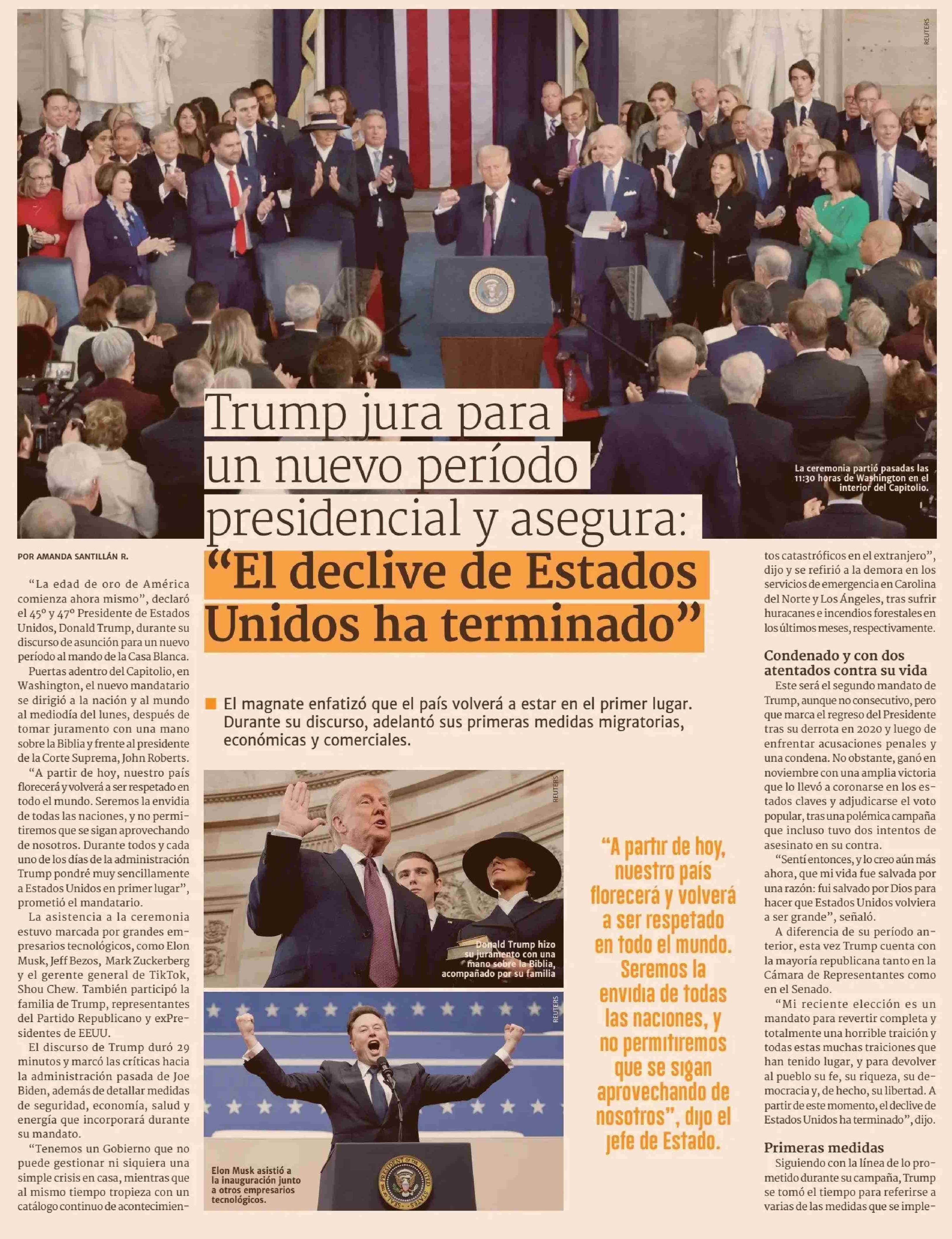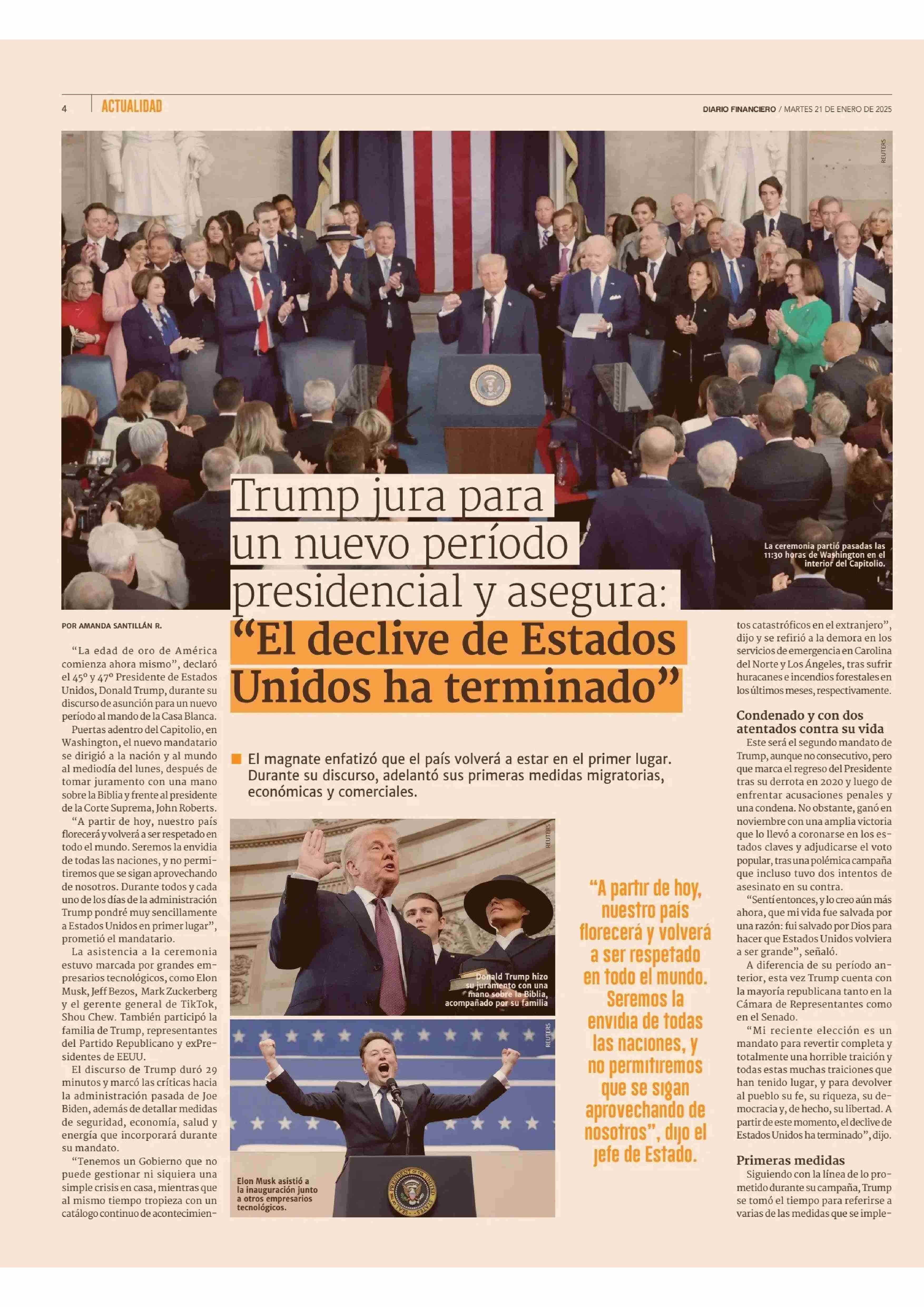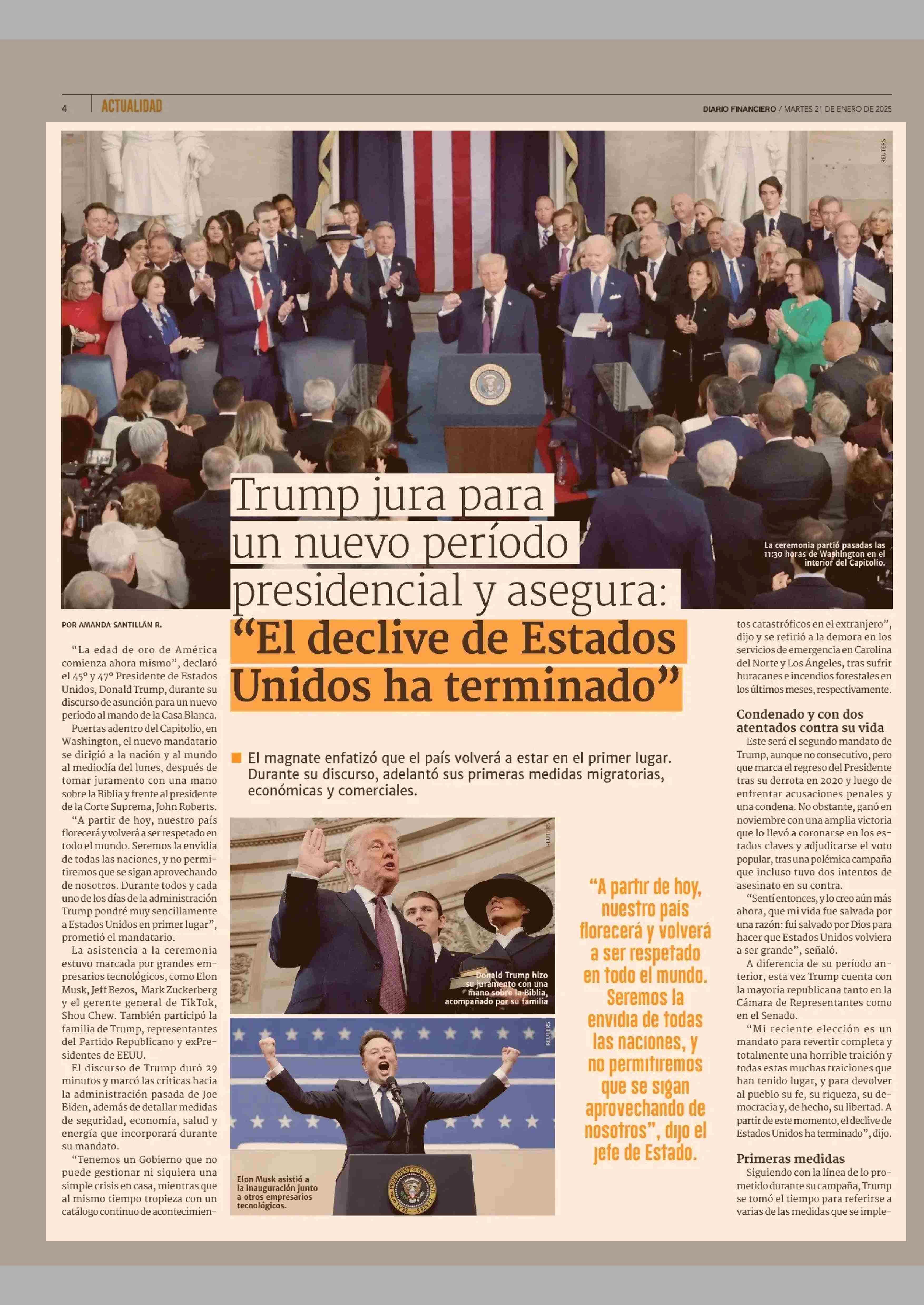 Trump jura para un nuevo periodo presidencial y asegura: “El declive de Estados Unidos ha terminado” 21-01-2025 Diario Financiero |