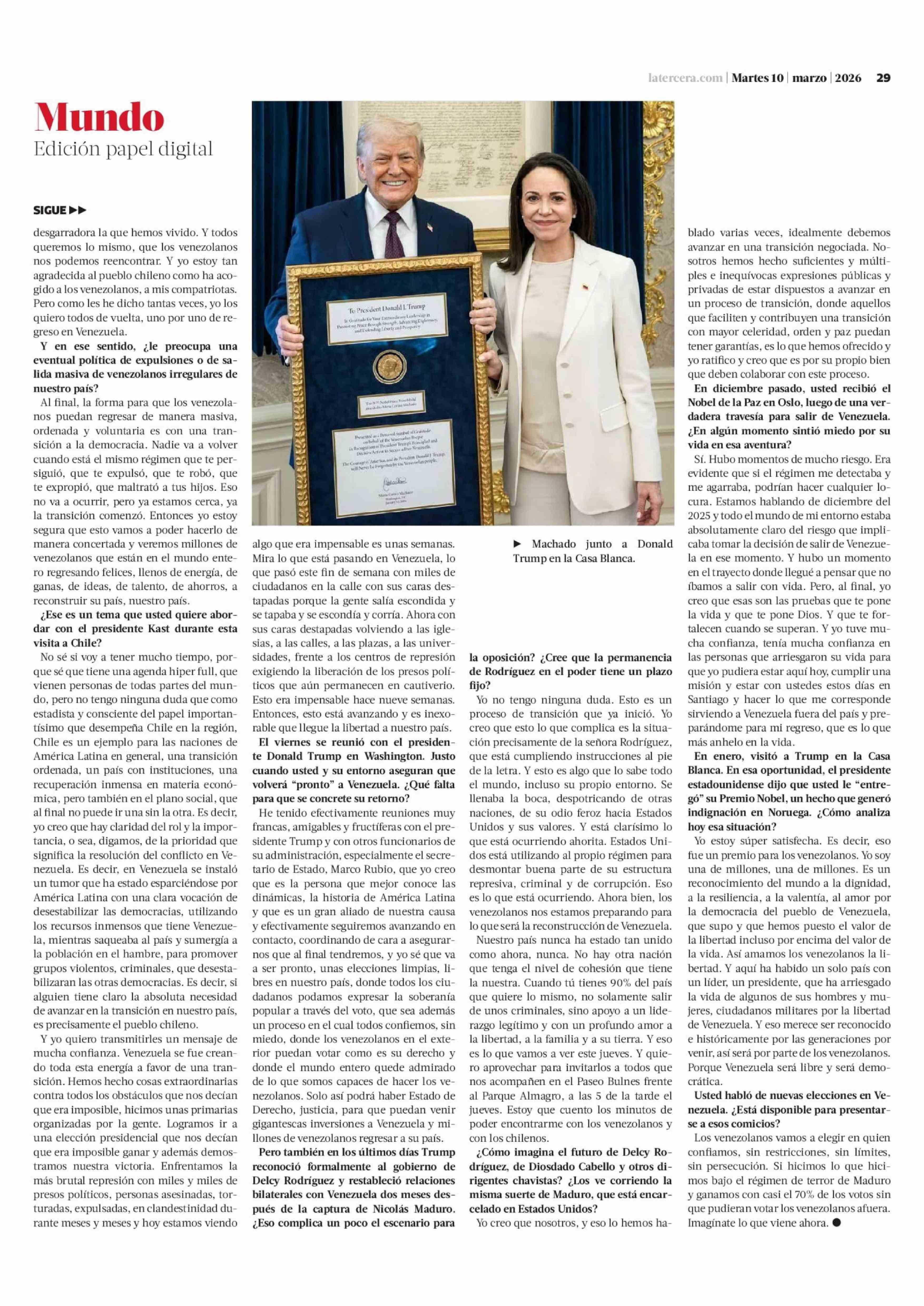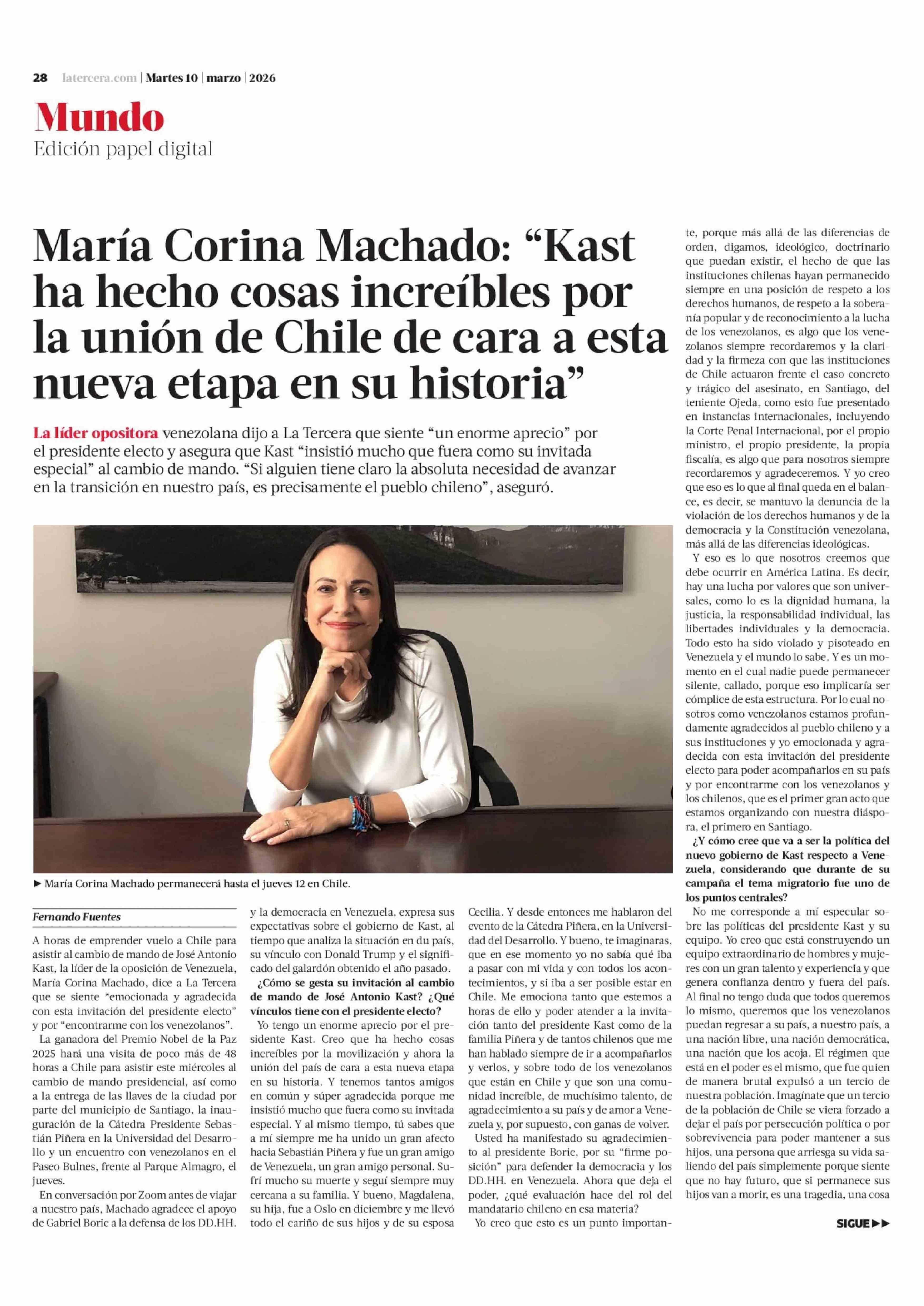 María Corina Machado: "Kast ha hecho cosas increíbles por la unión de Chile de cara a esta nueva etapa en su historia" 10-03-2026 La Tercera |