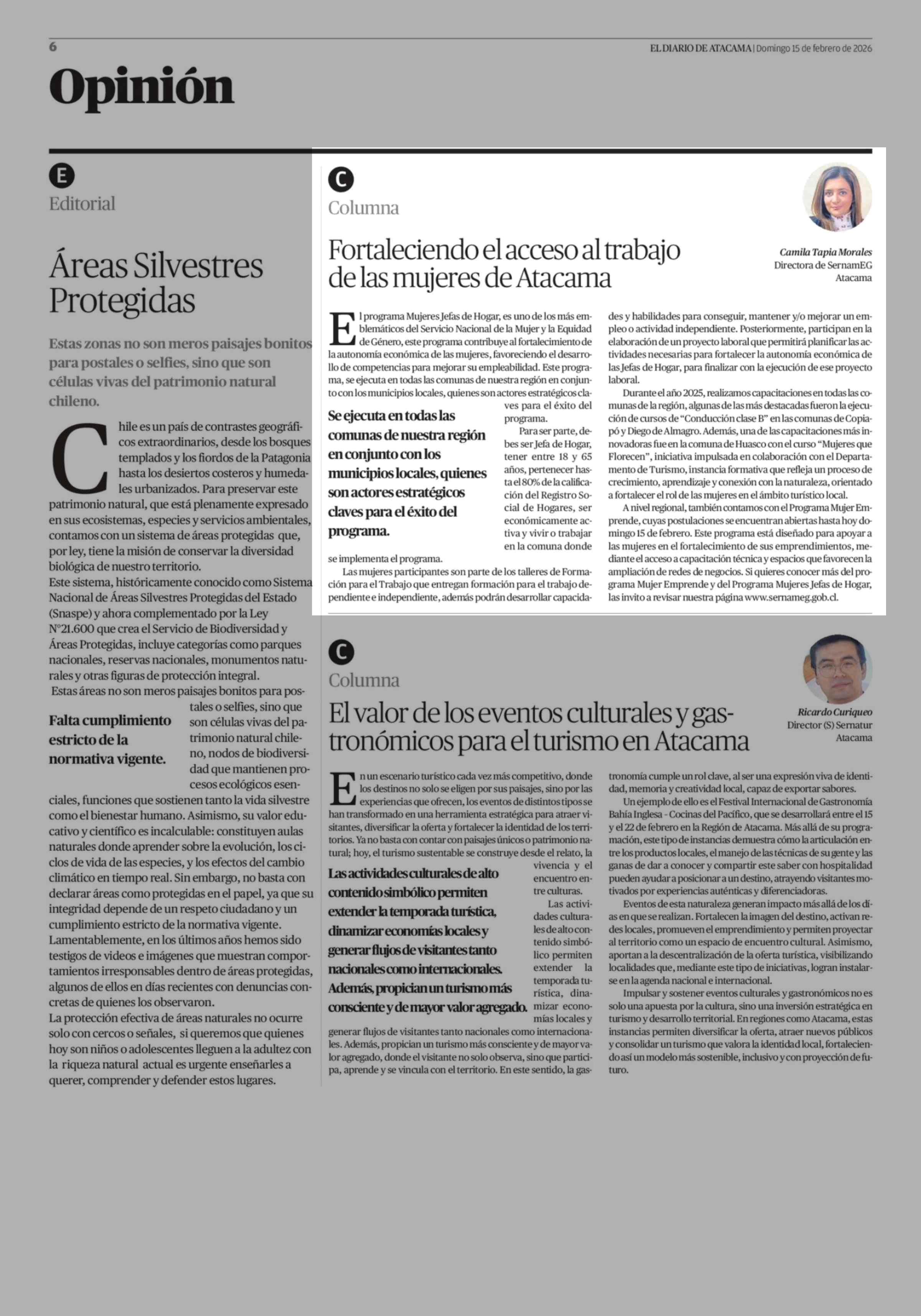 Columnas de Opinión: Fortaleciendo el acceso al trabajo de las mujeres de Atacama 15-02-2026 El Diario de Atacama |