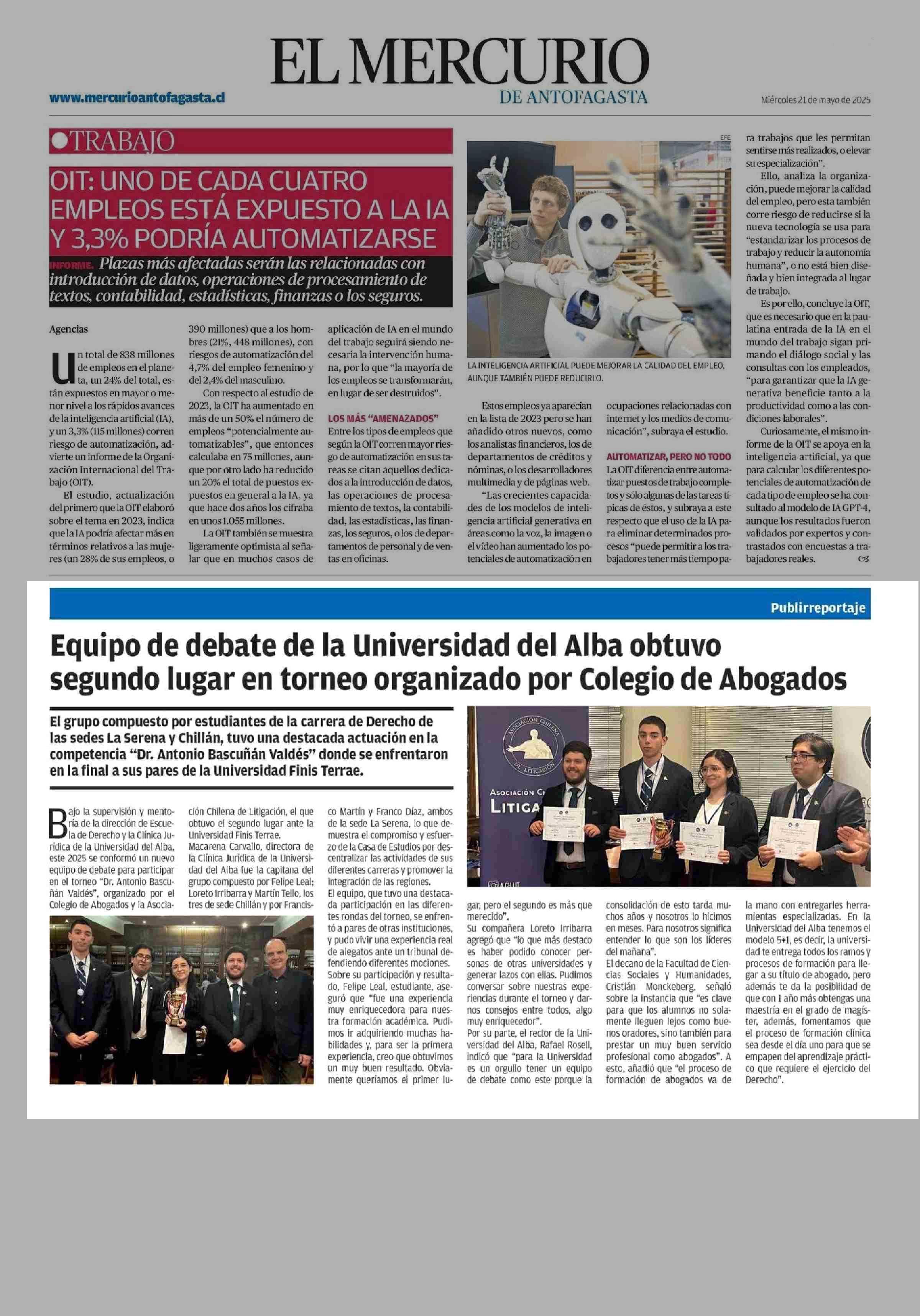 Equipo de debate de la Universidad del Alba obtuvo segundo lugar en torneo organizado por Colegio de Abogados 21-05-2025 El Mercurio de Antofagasta |