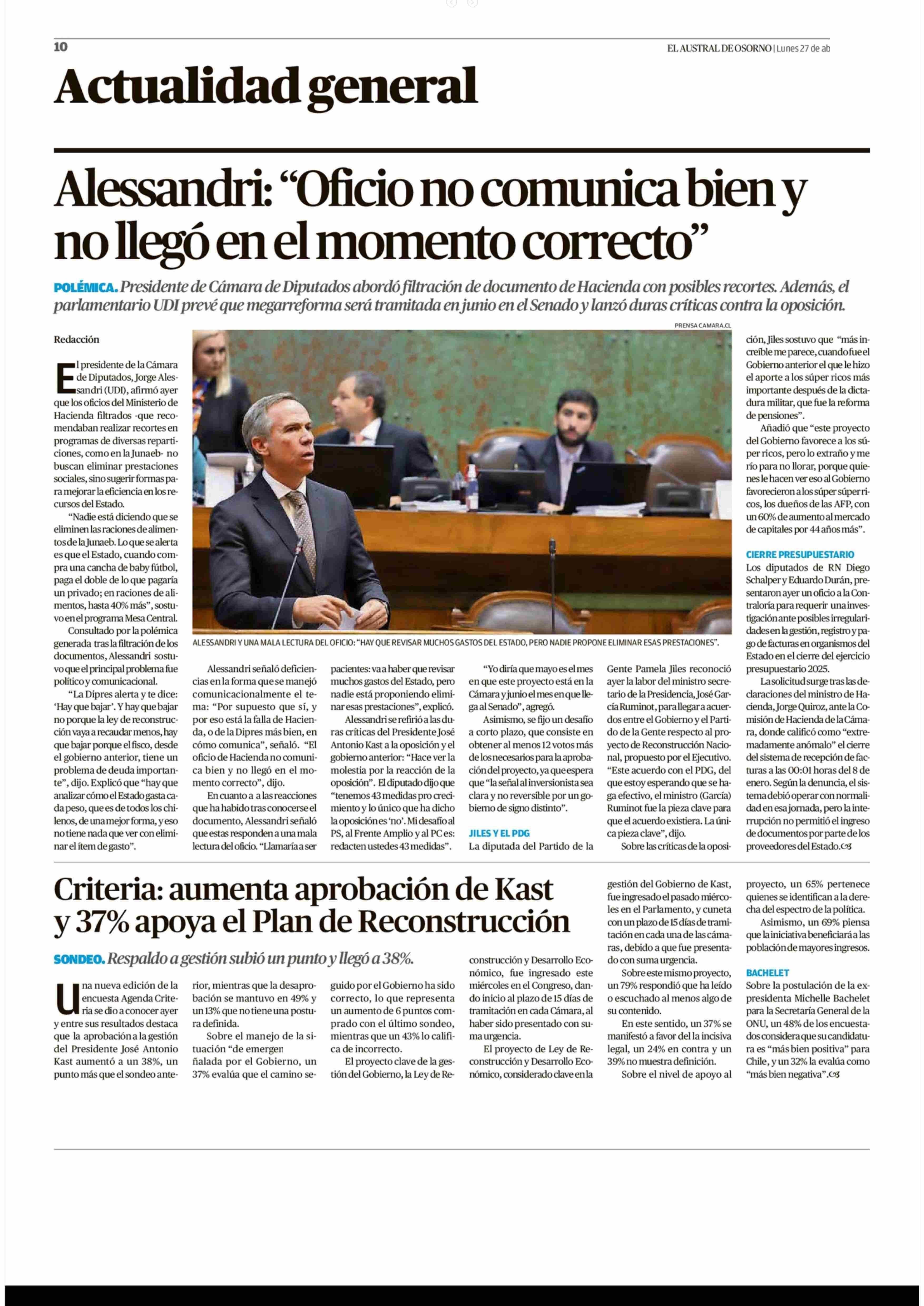 Criteria: aumenta aprobación de Kast y 37% apoya el Plan de Reconstrucción 27-04-2026 El Austral de Osorno |